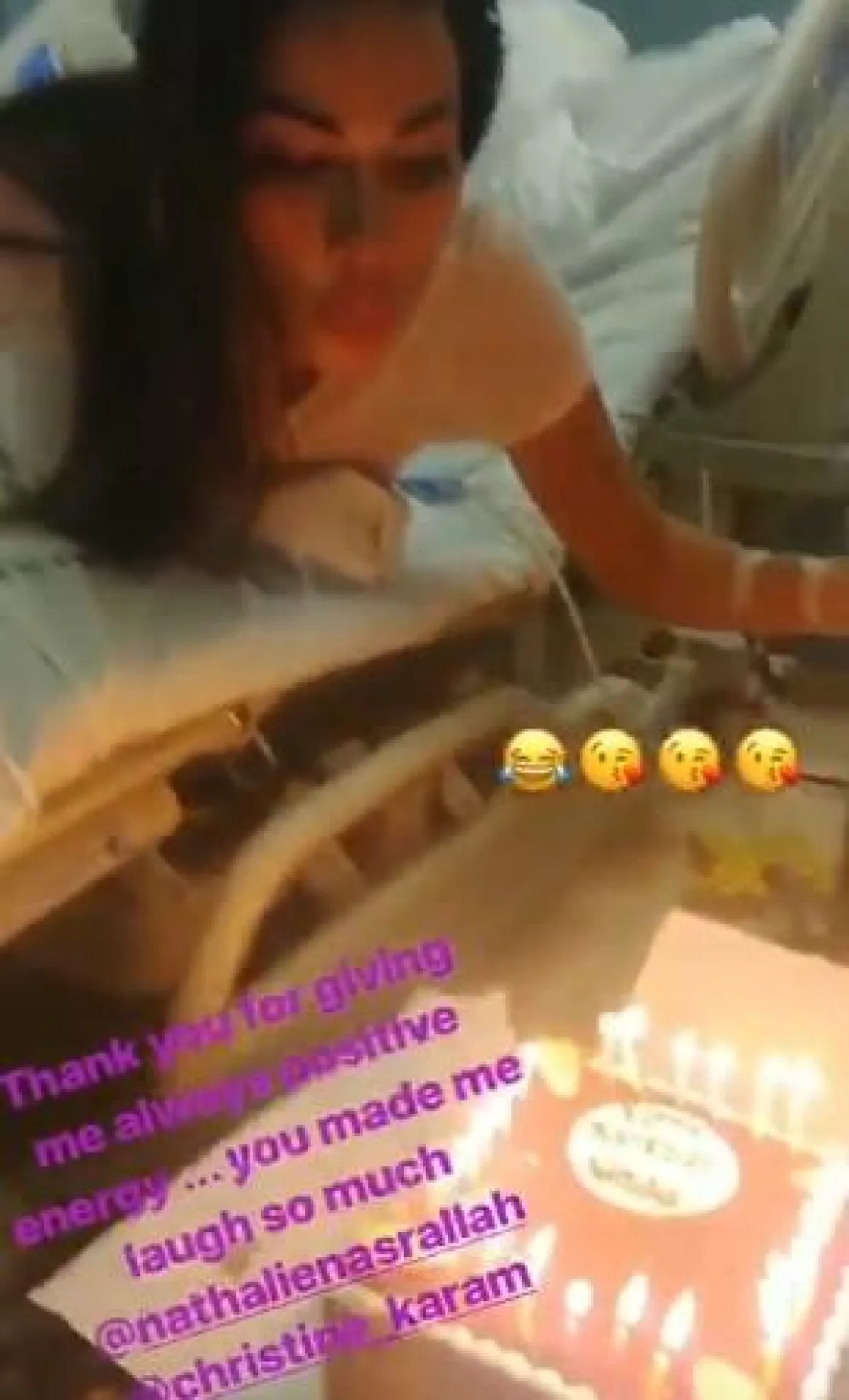 فوجئت الفنانة نادين نجيم قبيل مغادرتها المستشفى بالأمس، بوصول عدد من الصديقات اللواتي رغبن بالإحتفال معها بعيد ميلادها ومؤاساتها في مرضها.