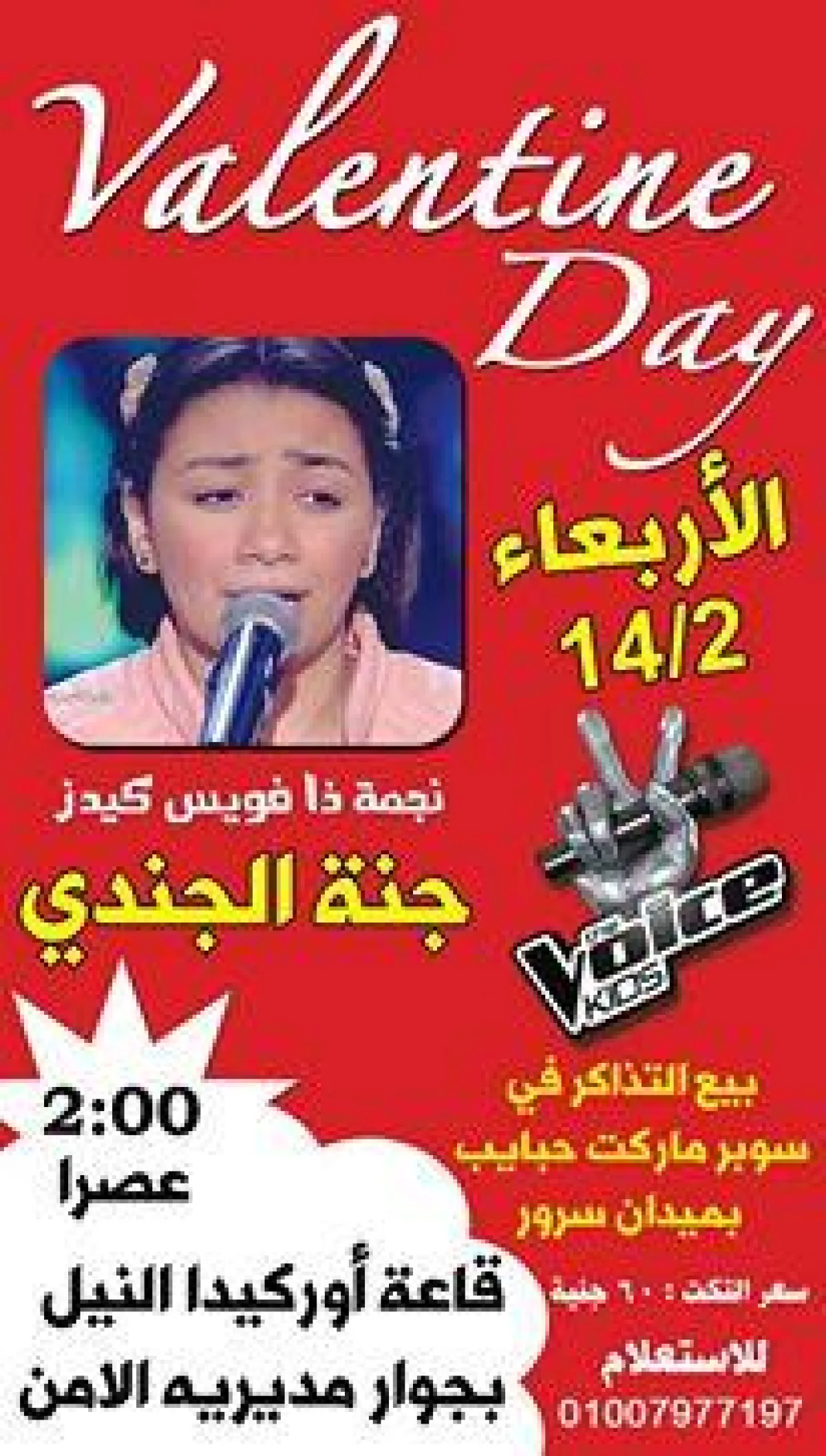 بدأت متسابقة الموسم الثاني من برنامج ذا فويس كيدز جنة الجندي، خطوتها الأولى لاستثمار ما حققته من شهرة بعد الاشتراك في منافسات البرنامج، واتفقت على تقديم أول حفل منفرد لها بمناسبة عيد الحب، وأعلن والدها رسميا ان التذاكر متاحة عبر "سوبر ماركت" في مدينتها الريفية دمياط!!