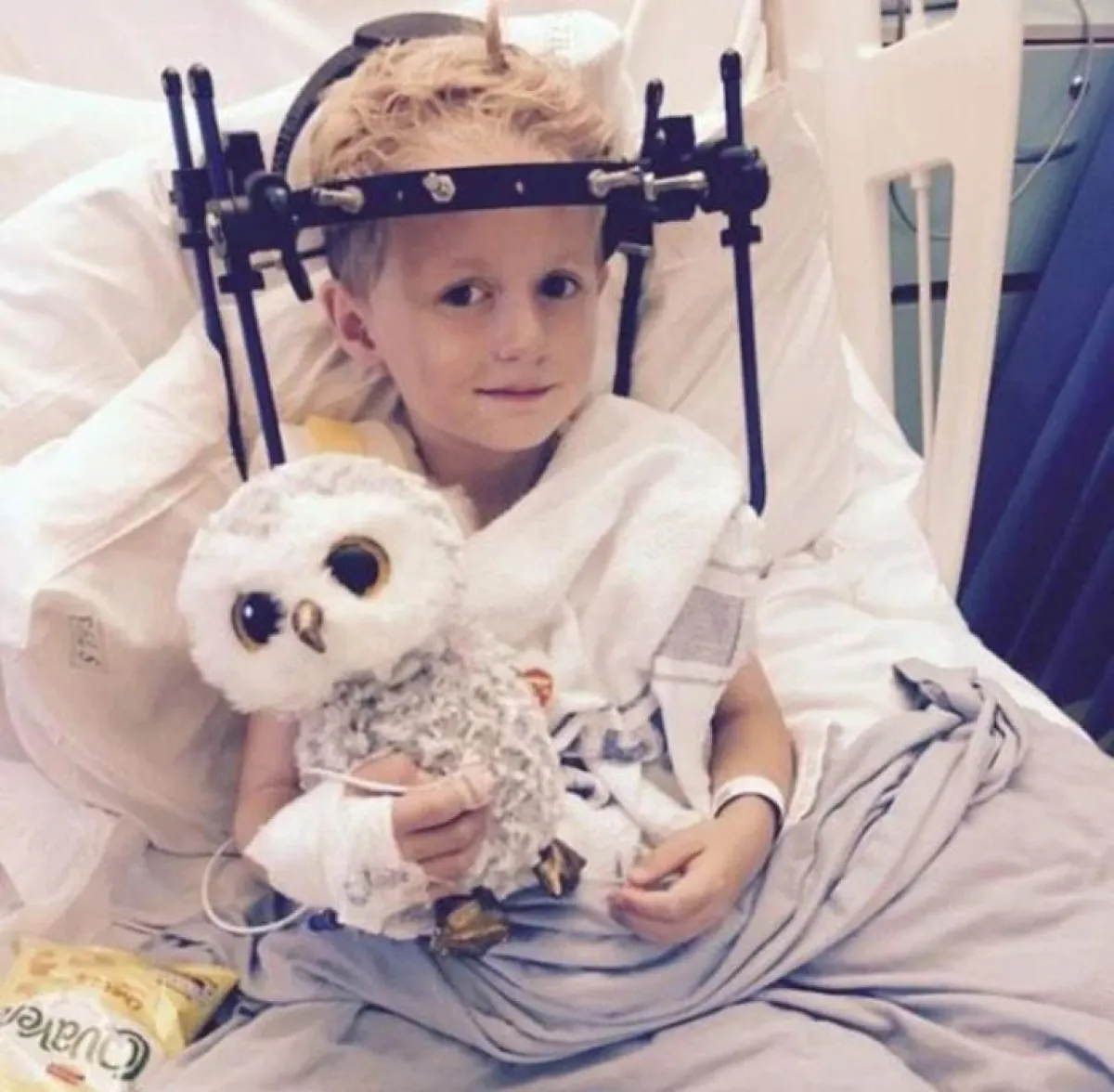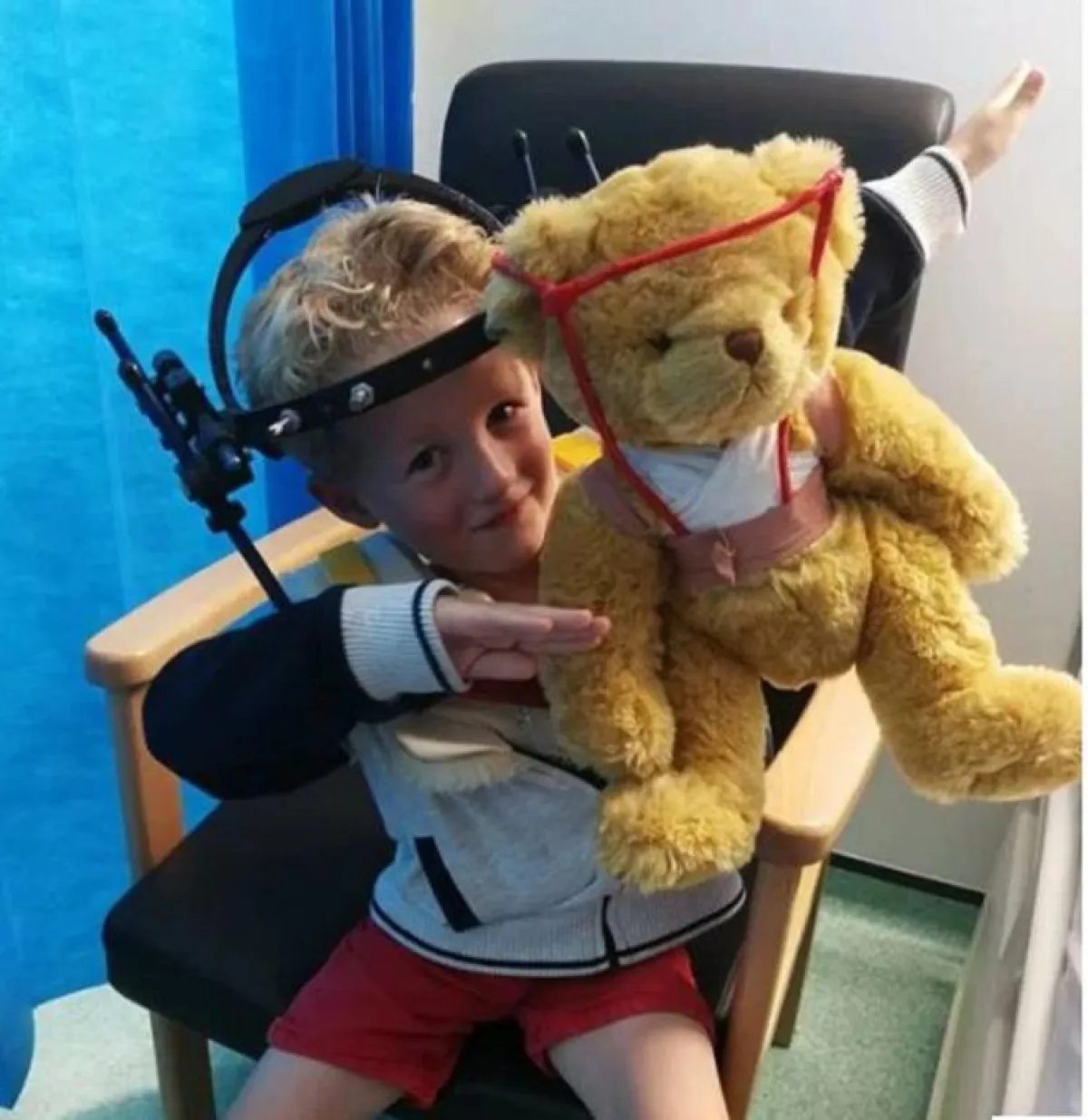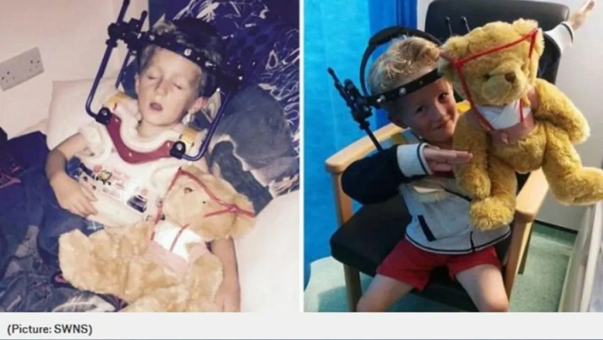 وركّب الطفل الدعامة المعدنية على رقبته لمدة 8 أسابيع، وقام جاره راشيل دارك- 30 عاماً- بإعطائه دباً بدعامة مماثلة مصنوعة من شريط وقش؛ لكي تساعده في تخطي الألم.