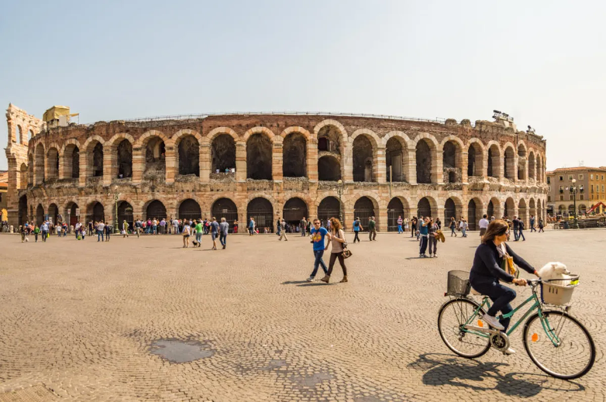 | "فيرونا أرينا": مدرج روماني، كان قد بُني في القرن الأوَّل، واستضاف عروض المصارعة. وهو المدرج الرابع بعد الكولوسيوم في روما وكابوا وميلانو. بنية المدرج صلبة، ويُغطِّيه الطوب والرخام. ويمكن أن يستضيف المدرج 000. 30 مُتفرِّج يأتون حاليًّا لحضور الحفلات الموسيقيَّة والأوبرا. علمًا بأنَّه يمكن بلوغ الموقع سيرًا على الأقدام من وسط المدينة. وتتطلَّب الجولة فيه دفع 10 يورو (ما يعادل 4. 12 دولارًا أميركيًّا).