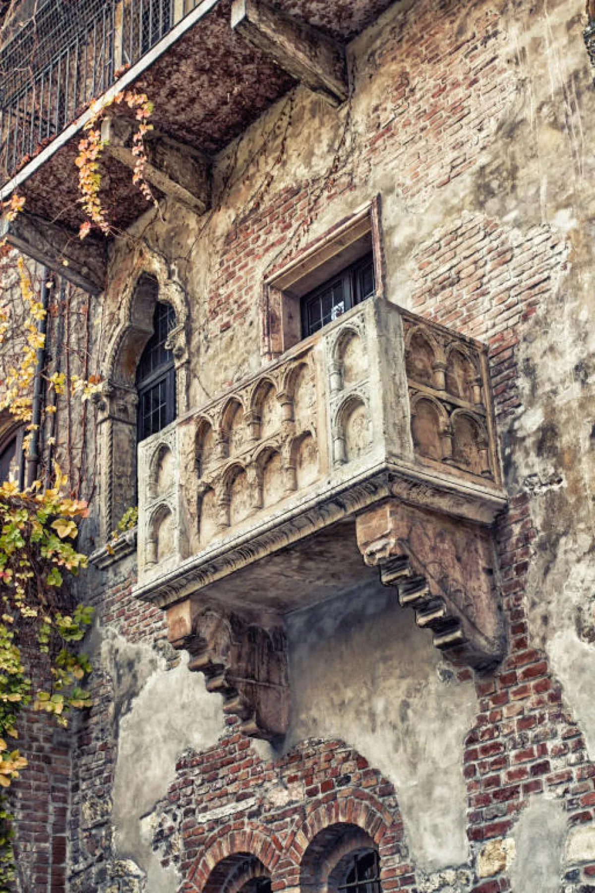 | بيت جولييت: يعود تاريخ المبنى إلى القرن الثالث عشر، وتحت شعار "كابوليت" على الواجهة الخارجيَّة، تنفتح بوَّابته على مساحة مُغطَّاة، حيث يترك العشَّاق من جميع أنحاء العالم رسائلهم. في الماضي، كان الزائرون يكتبون على الجدران، ما حدا بإدارة الموقع إلى تغطيتها بلوحات تستضيف اليوم الكتابات والبطاقات. ومن هناك، يصل الزائرون إلى المحكمة الداخليَّة، التي يتوسَّطها تمثال لجولييت مشغول بالبرونز. وفي المحكمة شرفة شهيرة، تقبع غرفة نوم جولييت المؤثَّثة خلفها. وقد أضيفت الغرفة للموقع، خلال مشروع ترميم تمَّ في ثلاثينيات القرن العشرين. في الواقع، عرف المبنى القديم استخدامات مختلفة على مرِّ القرون. أمَّا في الوقت الحاضر، فهو متحف.