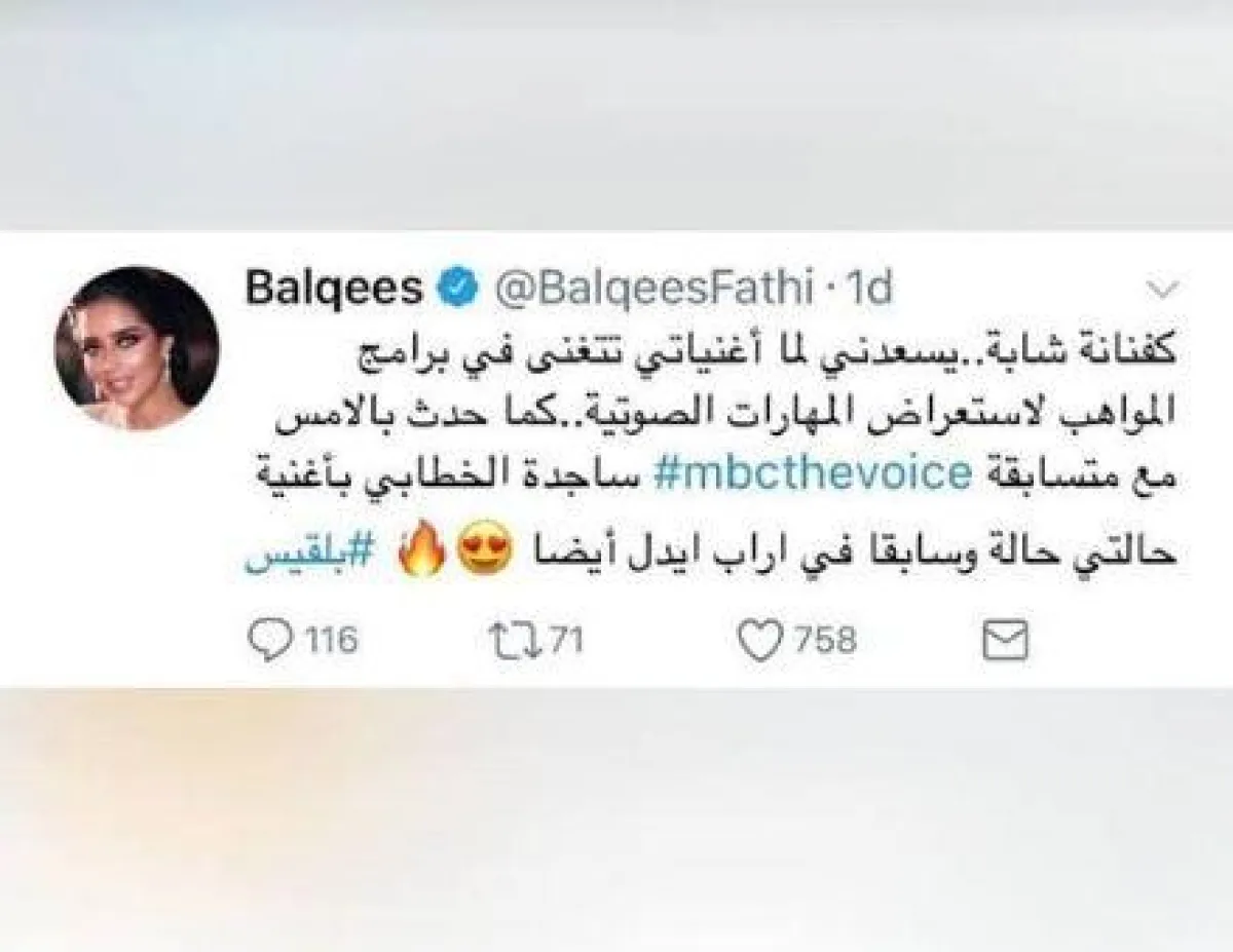 أعربت الفنانة اليمنية بلقيس عن سعادتها في اختيار أحد أعمالها لتأديته في برامج المواهب وقالت عبر حسابها على مواقع التواصل الاجتماعي : "كفنانة شابة.. يسعدني لما أغنياتي تتغنى في برامج المواهب لاستعراض المهارات الصوتية..كما حدث بالأمس مع متسابقة "ذا فويس" ساجدة الخطابي بأغنية "حالتي حالة" وسابقًا في أراب آيدول أيضاً".