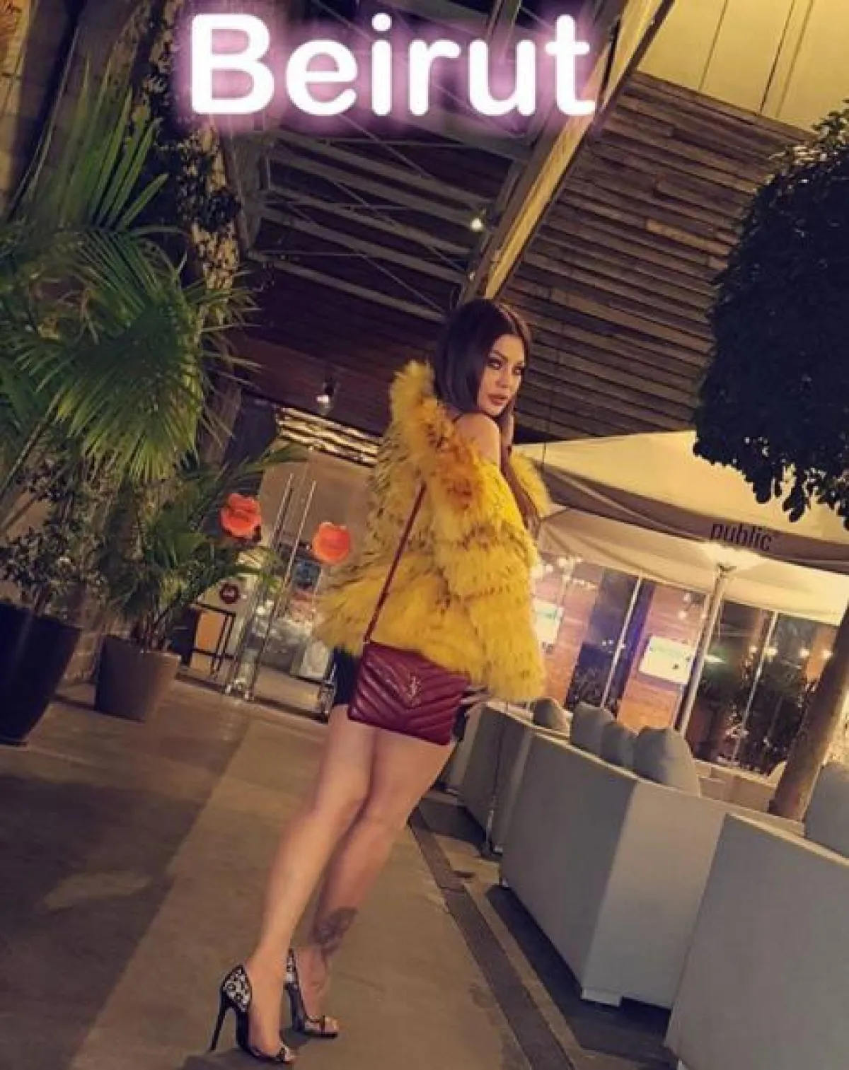 وظهرت هيفاء في الصورة التي التُقطت لها في العاصمة اللبنانية بيروت، وهي ترتدي معطفًا من الفرو باللون الأصفر من ErmannoScervino، وتحمل حقيبة من Yves Saint Laurent باللون الأحمر.