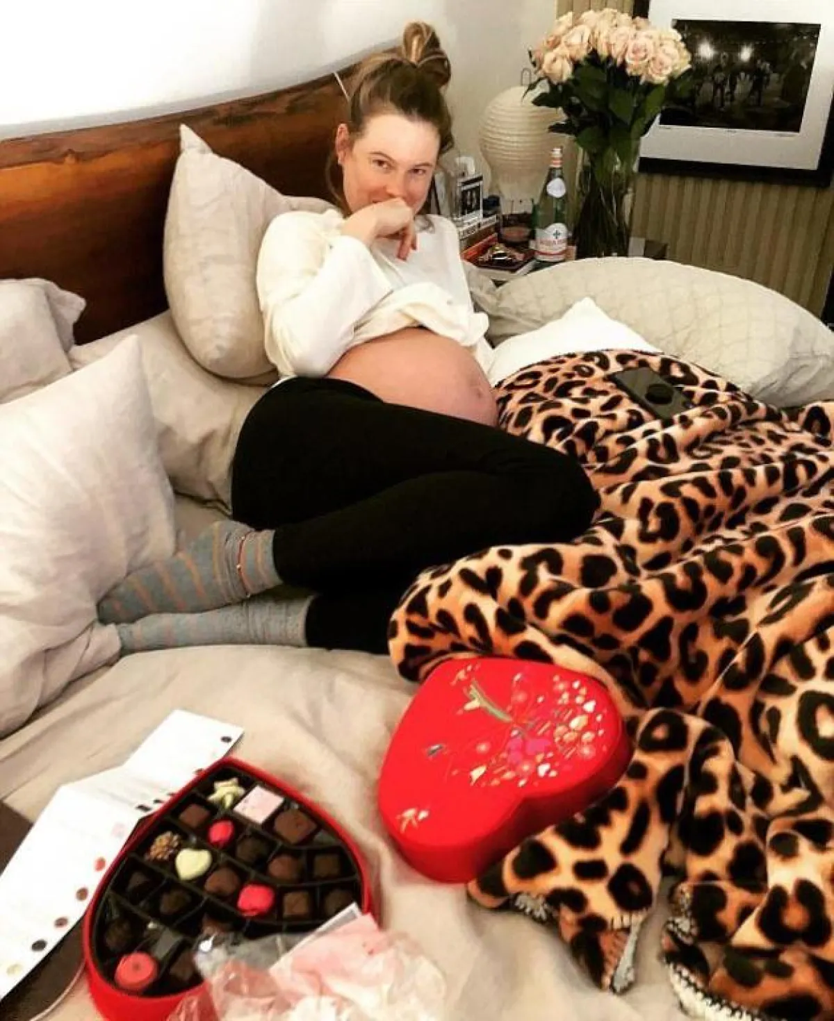 وكان آدم قد نشر منذ يومين صورة لزوجته، عارضة فيكتوريا سيكريت البالغة من العمر 28 عاماً، وهي في مرحلة متقدمة من الحمل، ومستلقية على السرير مع صندوق على شكل قلب فيه بعض الحلوى، وذلك احتفالاً بعيد الحب.