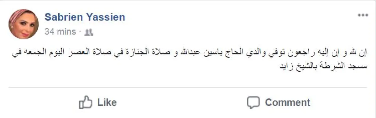 يذكر أن الفنانة صابرين أعلنت بالأمس، عبر حسابها الشخصي على موقع الفيس بوك، وفاة والدها ياسين عبد الله، بعد صراع طويل مع المرض، إذ تدهورت حالته الصحية في الفترة الأخيرة، وتم احتجازه بالمستشفى لمتابعة وضعه الصحي، ولكنه لم يستجب للعلاج.