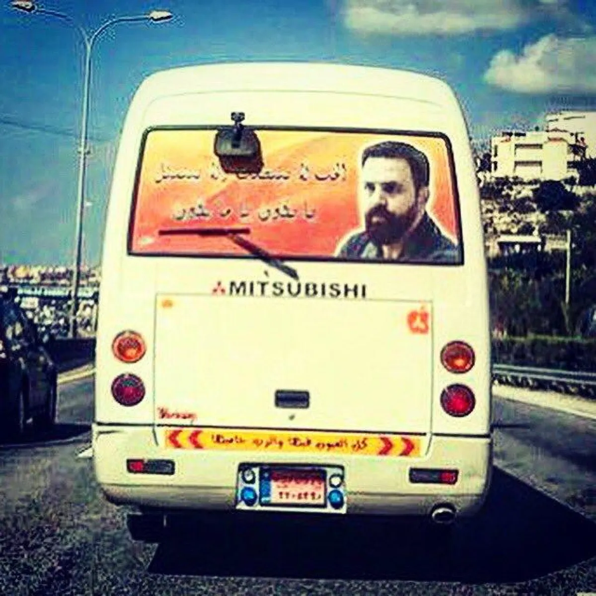 نشر الكاتب هوزان عكو صورة للفنان تيم حسن إحتلت الزجاج الخلفي لأحد "الفانات الكبيرة" وكتب عليها الحب لا بينطلب ولا بيتمثل يا بكون يا ما بكون.