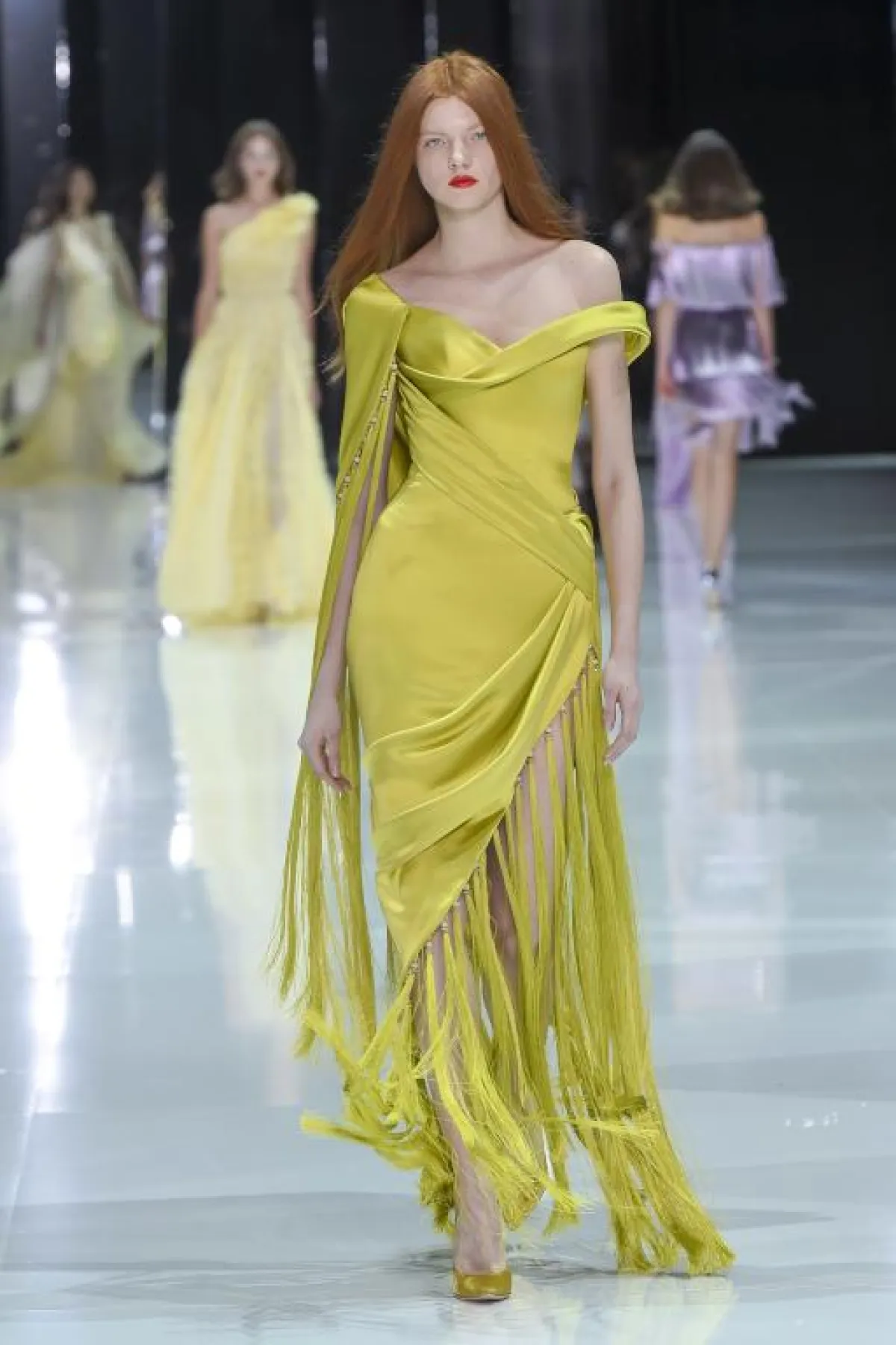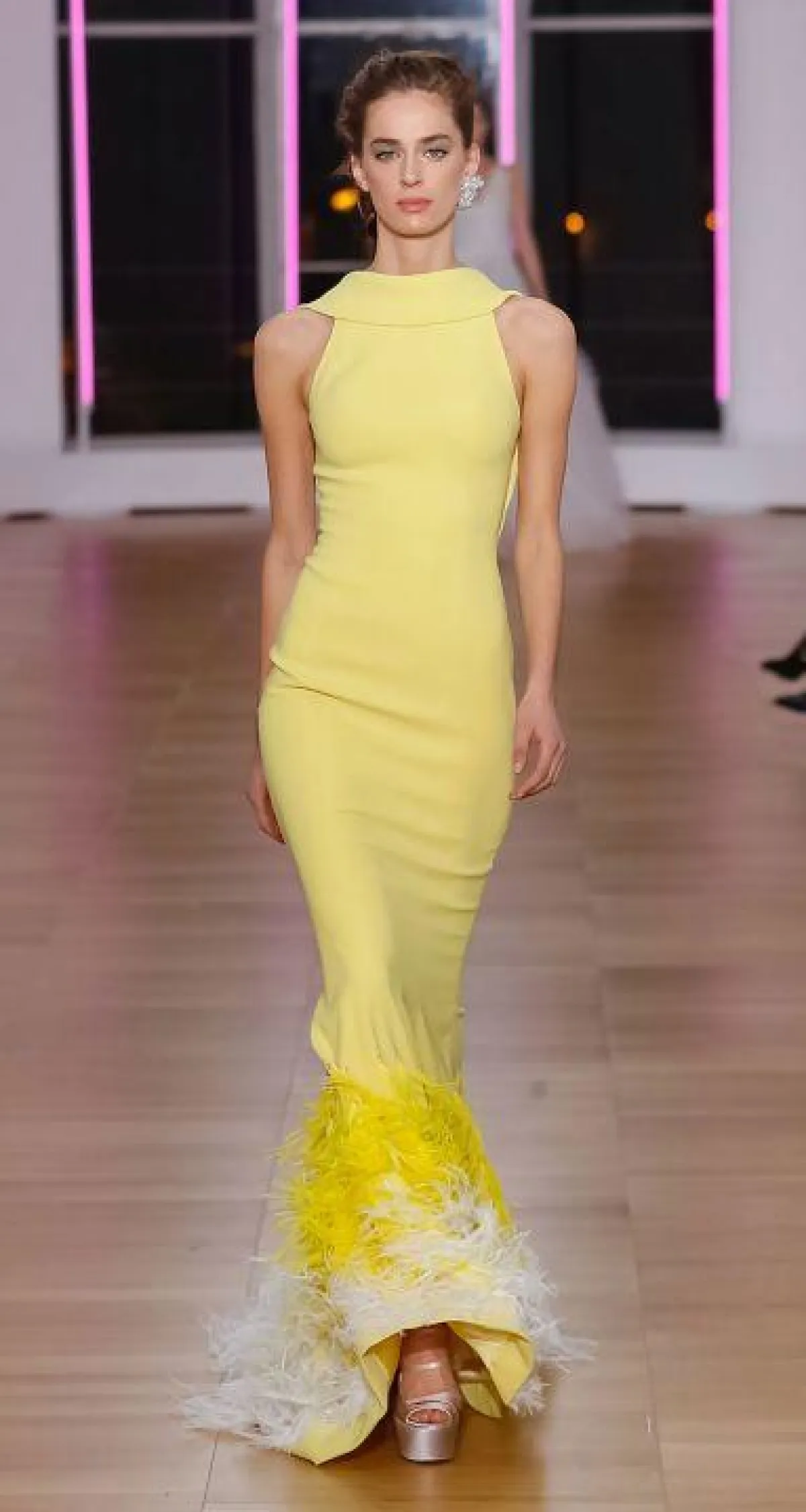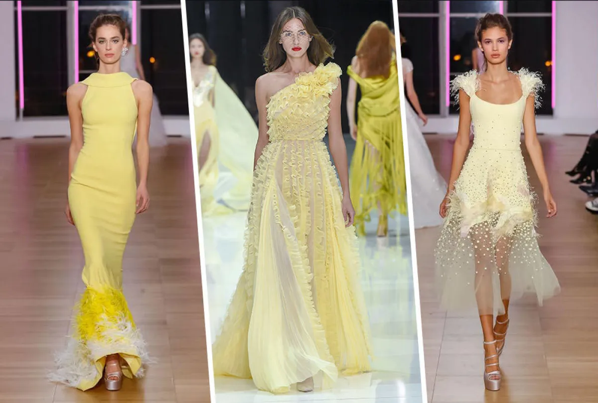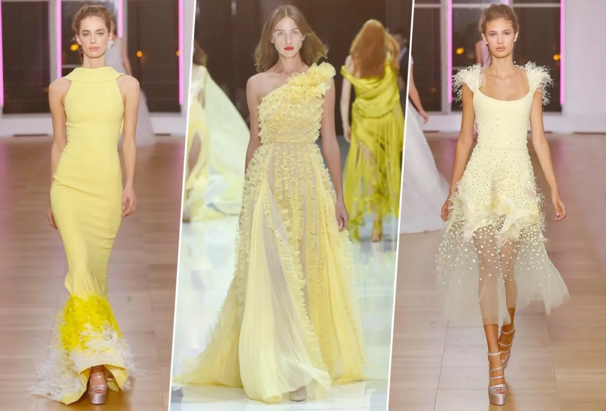 اختلفت تدرجات اللون الأصفر التي ظهرت على منصات العروض، بدءًا من الأصفر الفاتح، وصولًا إلى الأصفر الناري، الذي يليق بالعروس التي تحب الاطلالات الجريئة والمنعشة.