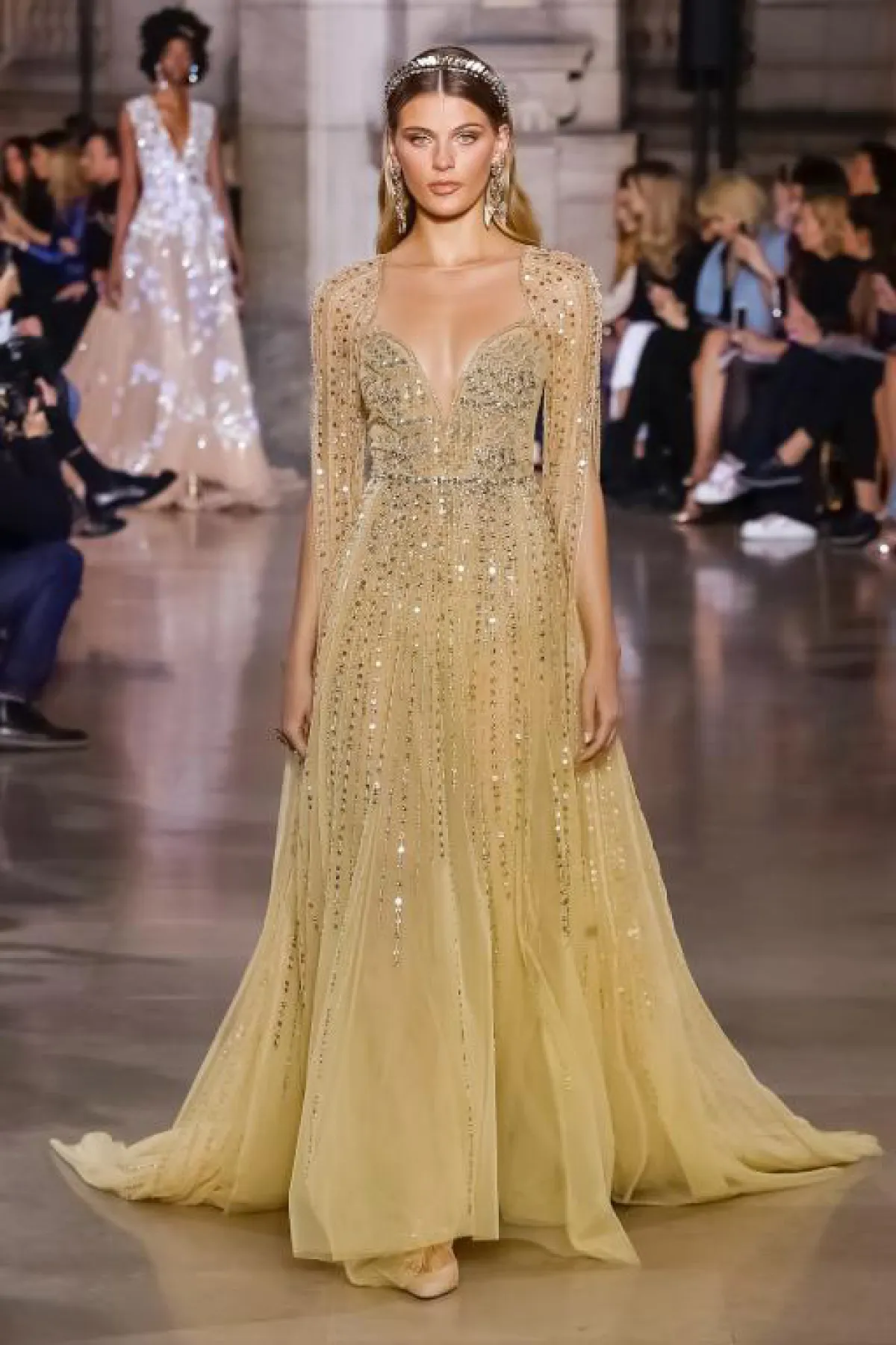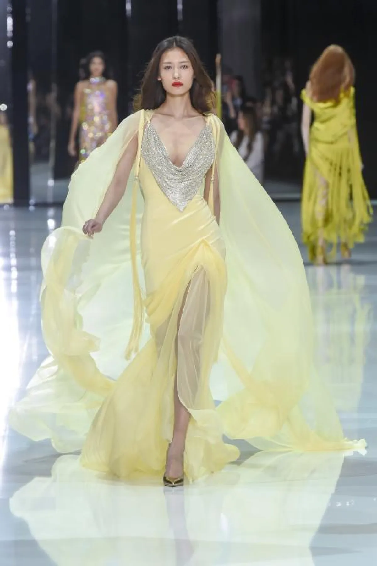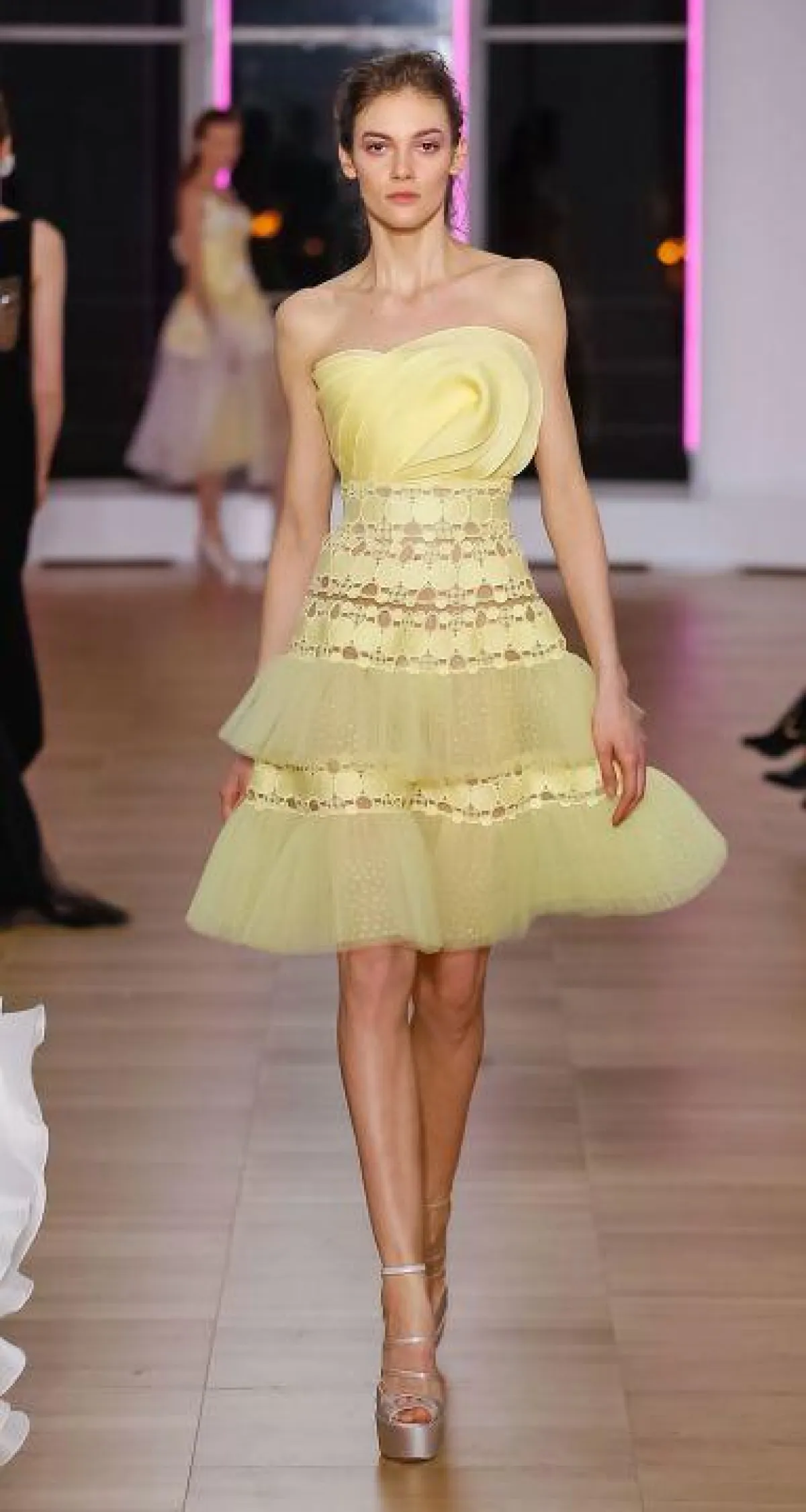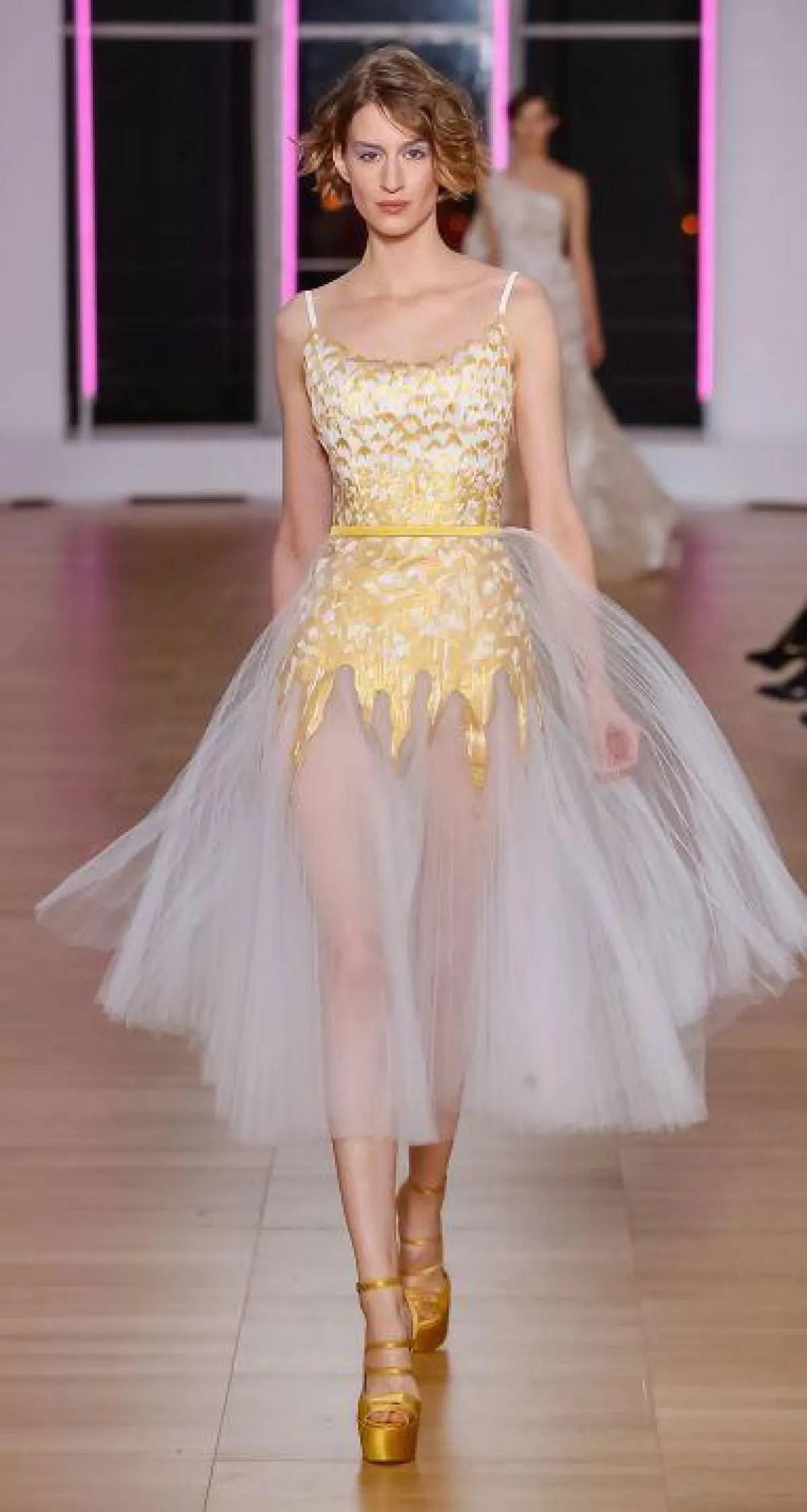 اختلفت تدرجات اللون الأصفر التي ظهرت على منصات العروض، بدءًا من الأصفر الفاتح، وصولًا إلى الأصفر الناري، الذي يليق بالعروس التي تحب الاطلالات الجريئة والمنعشة.