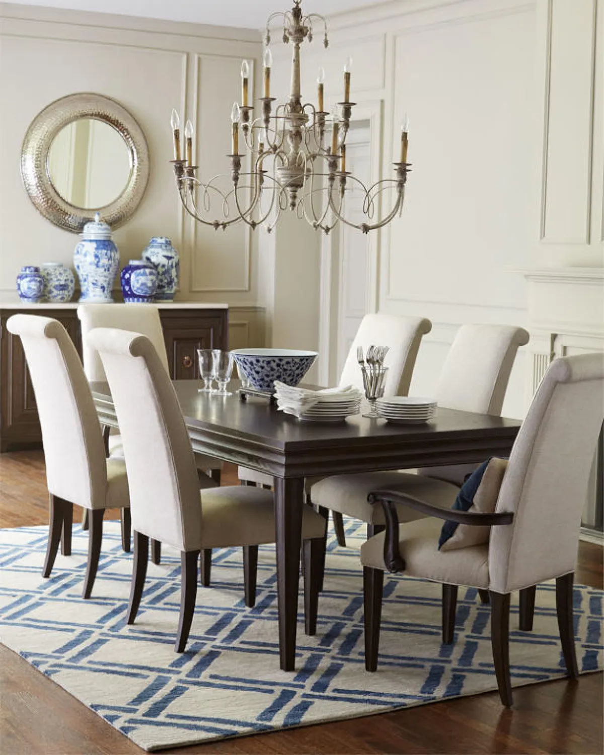 | السجادة المنقوشة في غرفة الطعام، تجعل الديكور يبدو حيويًّا.