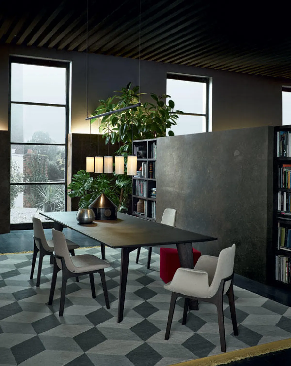 | الخشب الداكن ذو العروق البارزة يبدو أنيقًا في غرفة الطعام. وتُعزِّز حضوره وحدات الإضاءة المبتكرة، ما يُحقِّق إطلالة عصريَّة.