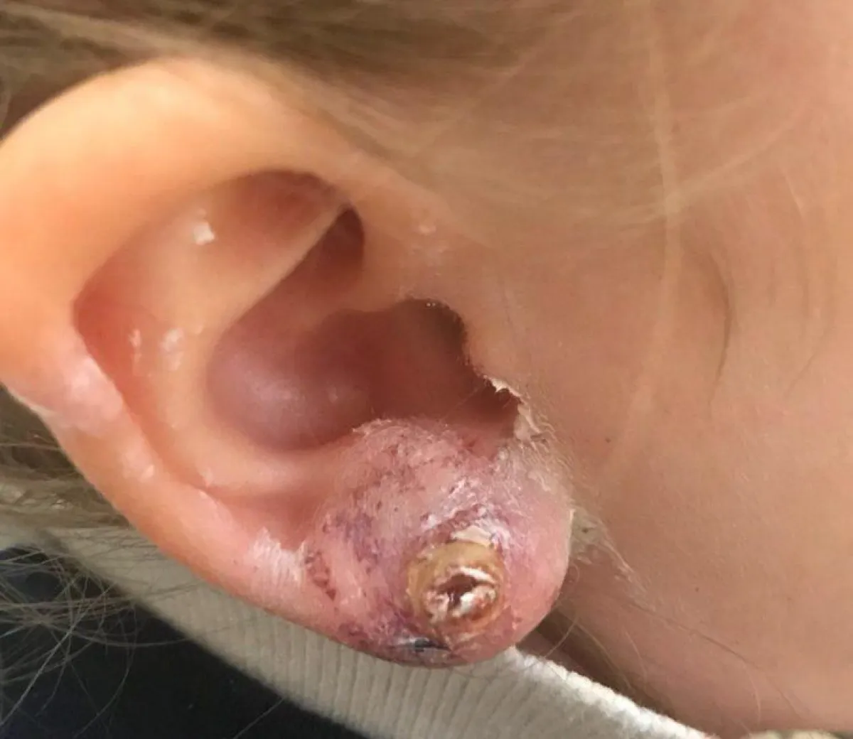 وأصيبت الطفلة إميليا مولوني (3 سنوات- من ايرلندا) بعدوى جعلتها بحاجة لجراحة تجميلية، بعد ان كانت ترتدي القرط لـ3 ليال متتالية.
