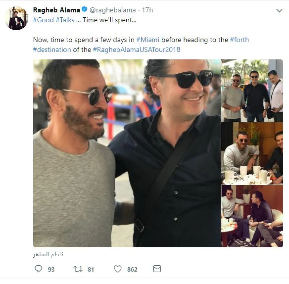 نشر الفنان اللبناني راغب علامة أربع صور له برفقة الفنان العراقي كاظم الساهر، مؤكدًا مغادرتهما قارب "ستارز أون بورد" بعدما توقفت في إحدى جزر البهاماس، حيث قام الفنانون والجمهور بجولة في مدينة فريبورت، وقال راغب إنه سيقضي بضعة أيام في ميامي.