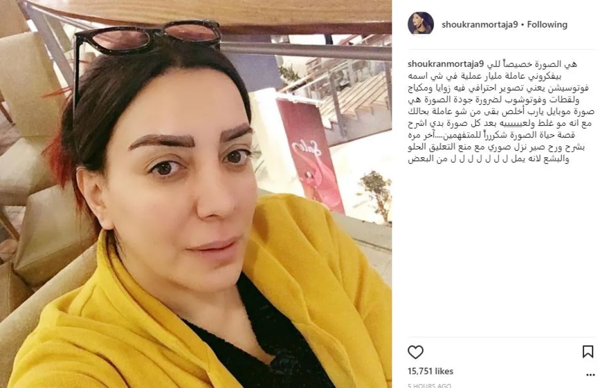 تسببت جلسة التصوير الأخيرة للفنانة السورية شكران مرتجي في عودة الشائعات حول خضوعها لجراحات تجميل، وحسماً للجدل، قامت شكران بنشر صورة لها بدون مساحيق تجميل، وعلقت عليها عبر حسابها بموقع إنستقرام قائلة: هي الصورة خصيصاً للي بيفكروني عاملة مليار عملية في شي اسمه فوتوسيشن يعني تصوير احترافي فيه زوايا ومكياج ولقطات وفوتوشوب لضرورة جودة الصورة هي صورة موبايل يارب أخلص بقى من شو عاملة بحالك مع انه مو غلط ولعييييييه بعد كل صورة بدي اشرح قصة حياة الصورة شكررراً للمتفهمين....آخر مره بشرح ورح صير نزل صوري مع منع التعليق الحلو والبشع لانه يمل ل ل ل ل ل ل ل من البعض.