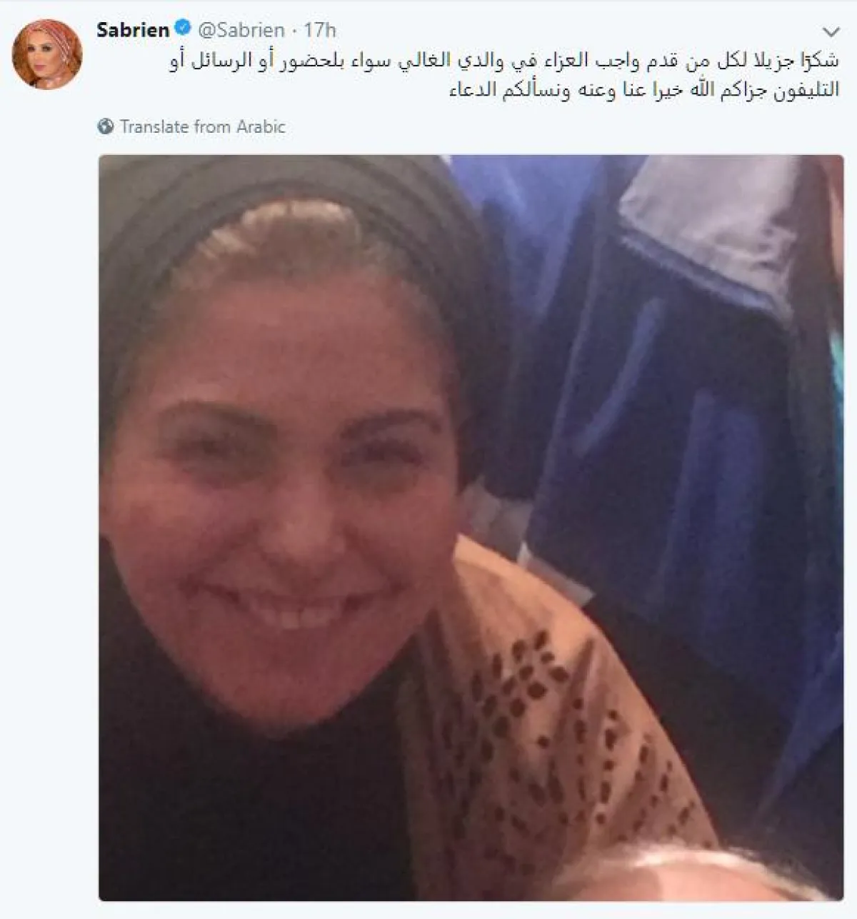 وكتبت الفنانة صابرين، عبر حسابها على موقع تويتر:" شكرًا جزيلًا لكل من قدم واجب العزاء في والدي الغالي سواء بالحضور أو الرسائل أو التليفون جزاكم الله خيرا عنا وعنه ونسألكم الدعاء".