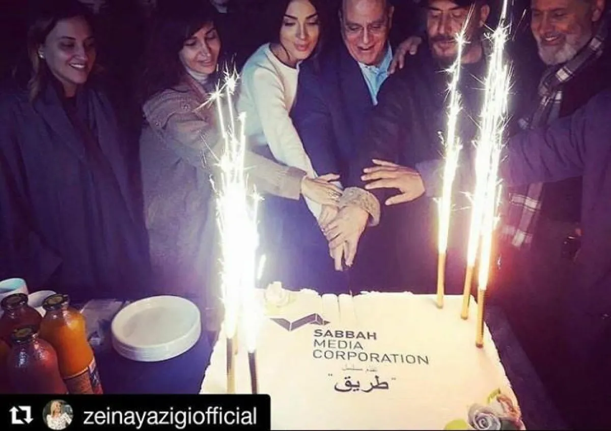 وبدا في الصورة المنتج صادق الصباح والمخرجة رشا شربتجي ولمى الصباح والممثلان عابد فهد ونادين نجيم وهم يقطعون قالب الحلوى احتفالاً ببدء التصوير.