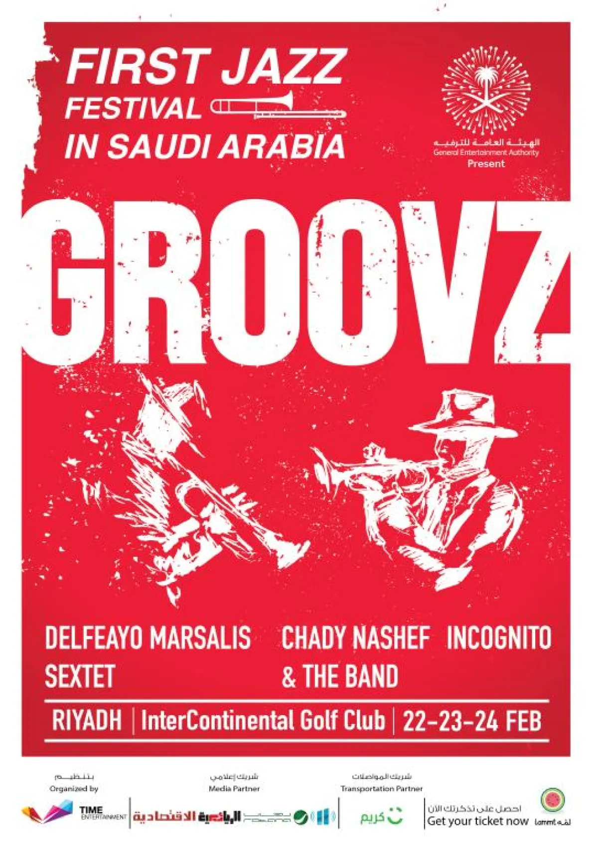 فبتنظيم من شركة Time Entertainment، سيشارك أحد أعظم عازفي "الترمبون" من الجيل الحالي Delfeayo Marsalis، المعروف بتقنياته الموسيقية المبتكرة، إلى جانب الفرقة البريطانية Incognito، التي تأسَّست عام ١٩٧٩، وتضم مجموعة من أهم الموسيقيين في عالم الجاز، وطافت بألحانها أصقاع الأرض، كما يشارك في المهرجان العازف اللبناني المبهر شادي ناشف، فيما تكشف فرقة سعودية من الرياض عما تملكه من مواهب لمحبي هذا الفن العريق.