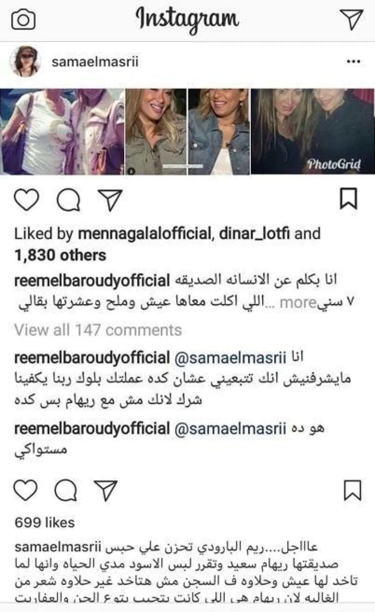 نشرت الفنانة ريم البارودي رسالة تدعم فيها صديقتها الإعلامية ريهام سعيد في المشكلة التي تعرضت لها مؤخراً، وأدت إلى دخولها السجن، وعبرت فيها عن حزنها، وطالبت بالدعاء لها من أجل أولادها، ودخلت سما المصري في اشتباك لفظي مع ريم في التعليقات، لترد عليها ريم أنها لا يشرفها معرفتها وتابعت: «ربنا يكفينا شرك» مضيفة «هو ده مستواك»، وقامت بعمل بلوك لها على حسابها، لتنقل المصري الخلاف إلى حسابها، وتوجه هجومًا لفظيًا لريم.