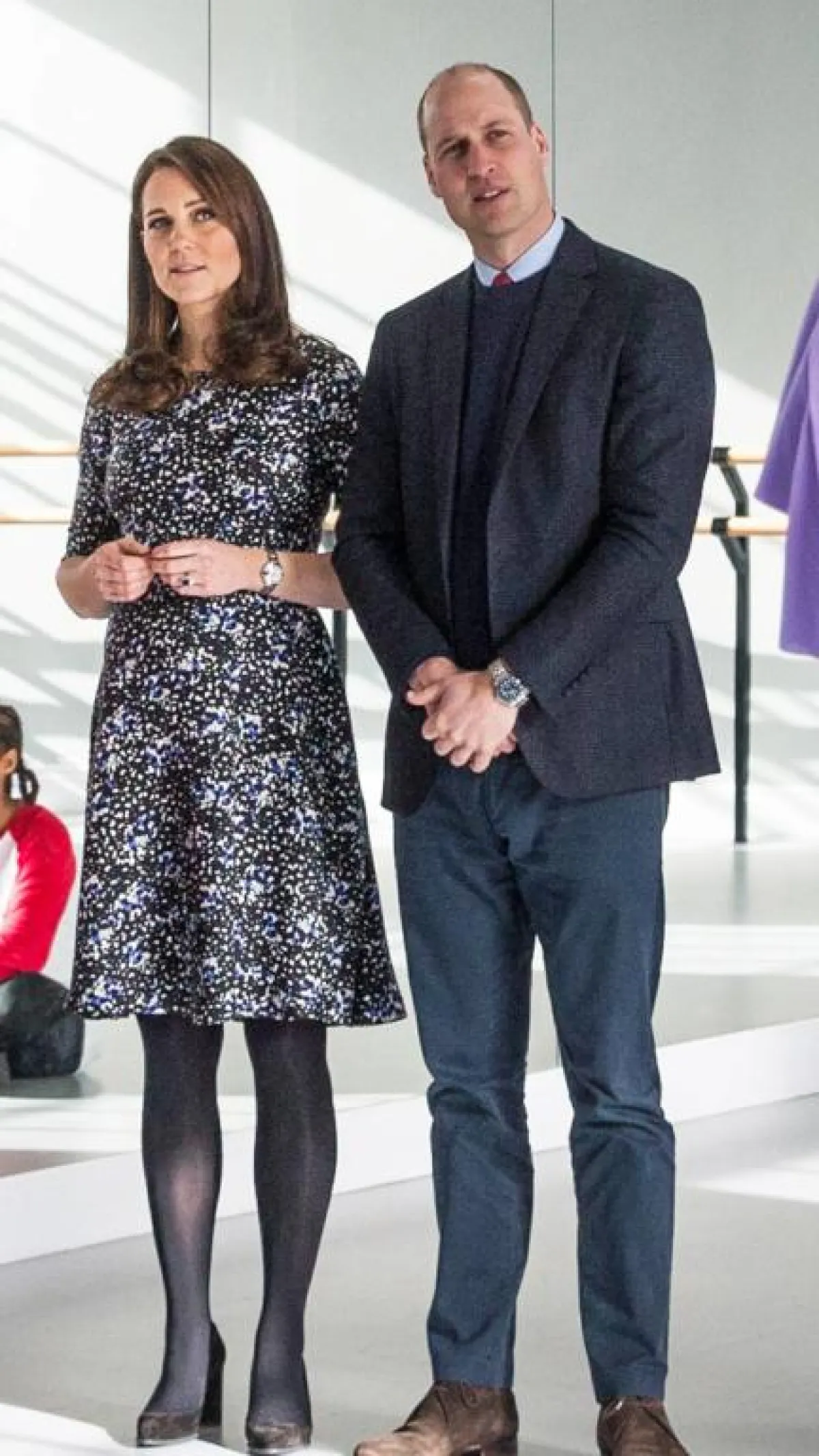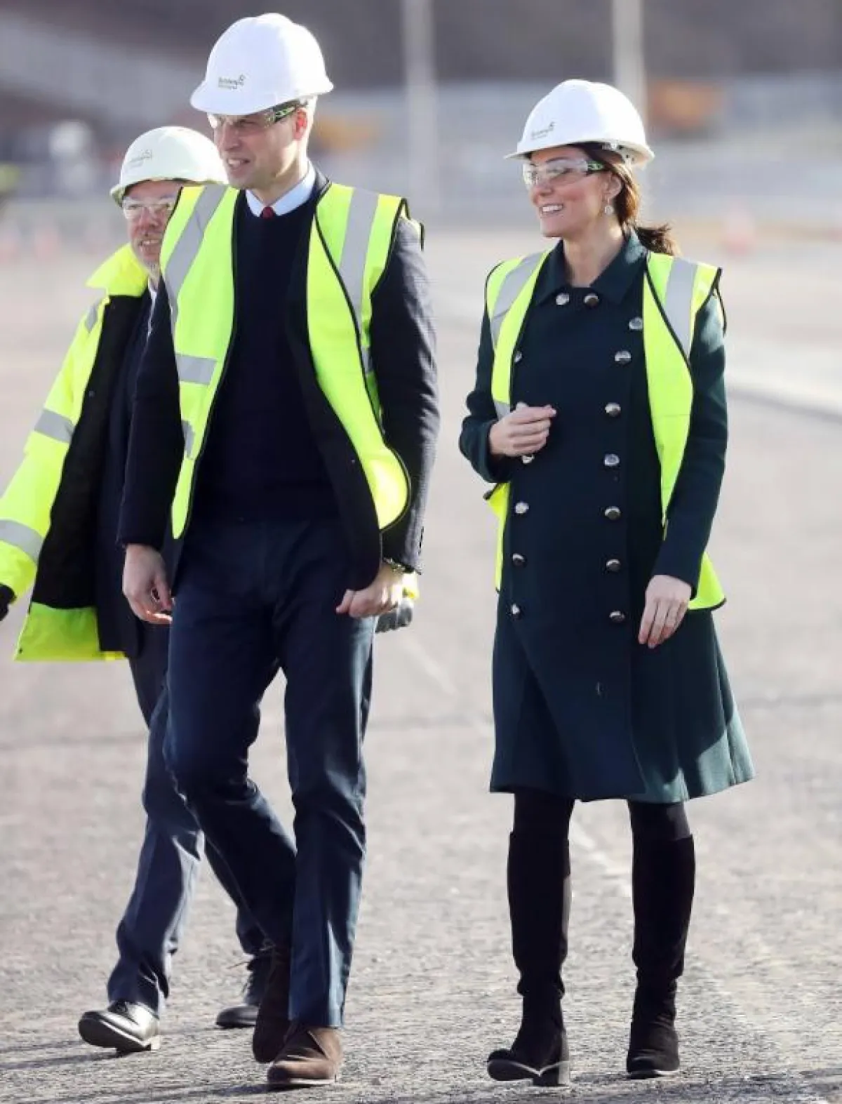 وخلال الإحتفال أطلت الدوقة كيت ميدلتون التي تنتظر طفلها الثالث في شهر أبريل \نيسان , بثوب حمل أنيق من دار Seraphine ومعطف داكن اللون بأزرار ذهبية من دار Dolce & Gabbana ارتدت فوقه ثياب العمال أثناء تجولها مع زوجها الأمير وليام في مواقع البناء والعمل في المركز.