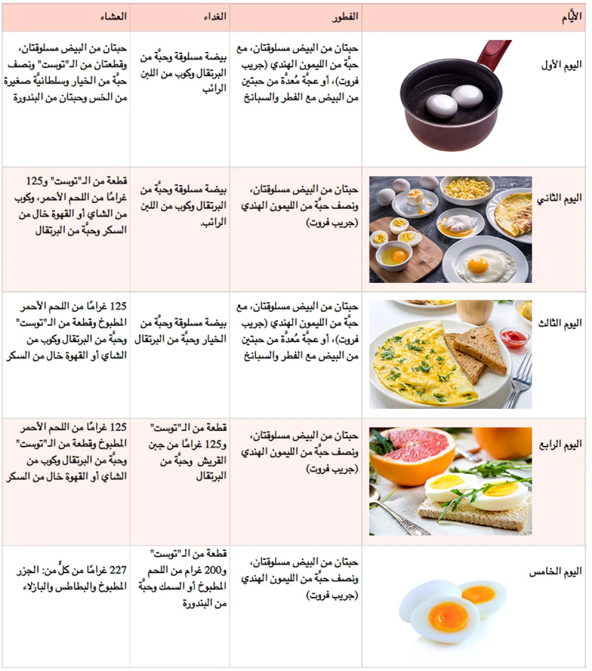 لا يصحُّ اتباع "رجيم" البيض الآتي لأكثر من خمسة أيَّام. ومن الضروري أن تلي أيَّام الـ"رجيم"، فترة استراحة تمتدُّ ليومين، قبل تكرار أيَّام الـ"رجيم" الخمسة لمرَّة حصرًا. كما من الهام استخدام البيض العضوي في الوجبات.
