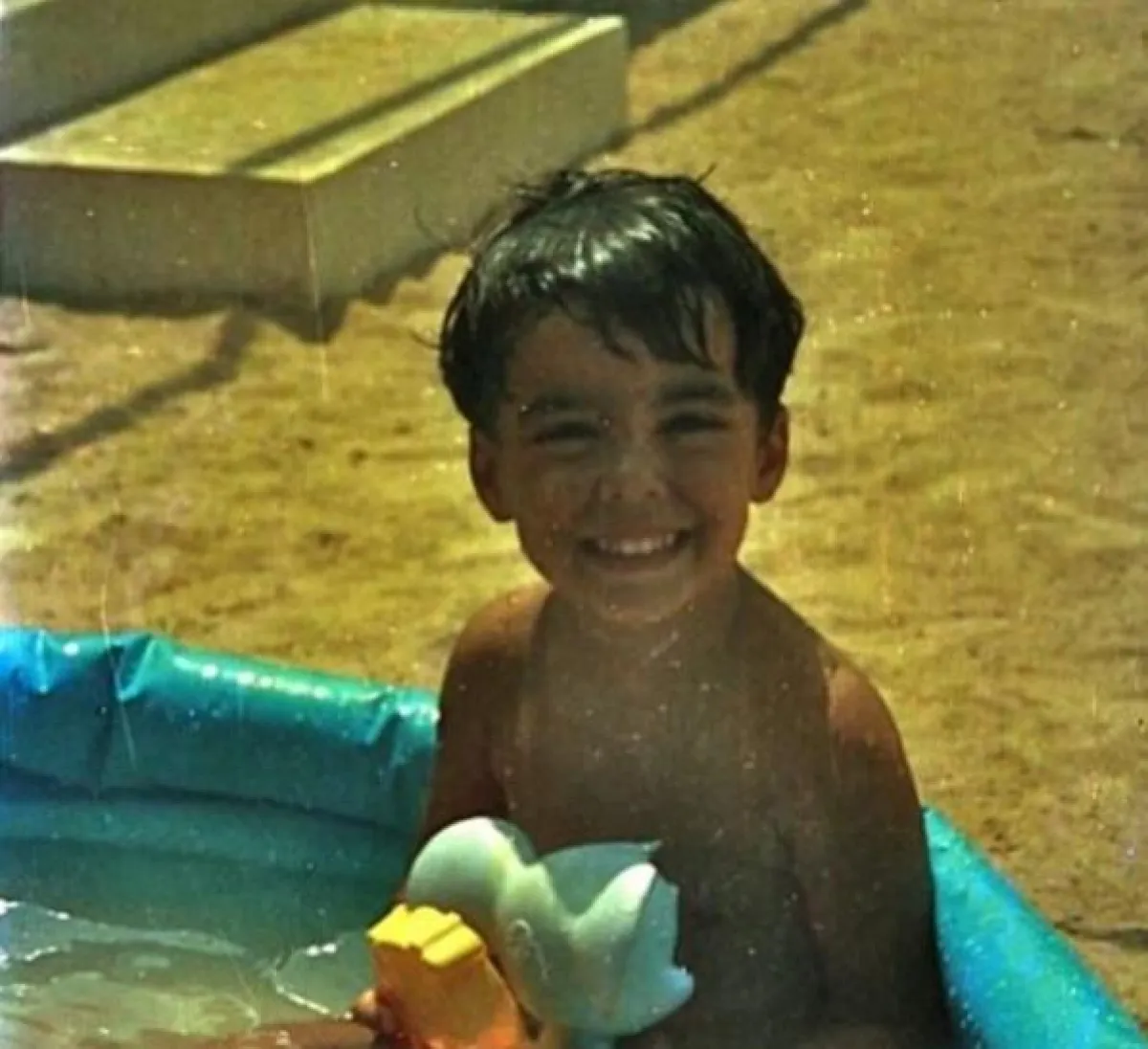 نشر الفنان الشاب حسن الشافعي صورة له في مرحلة الطفولة وهو يلعب في حمام سباحة صغير ممسكاً بمجموعة من الألعاب الخاصة به