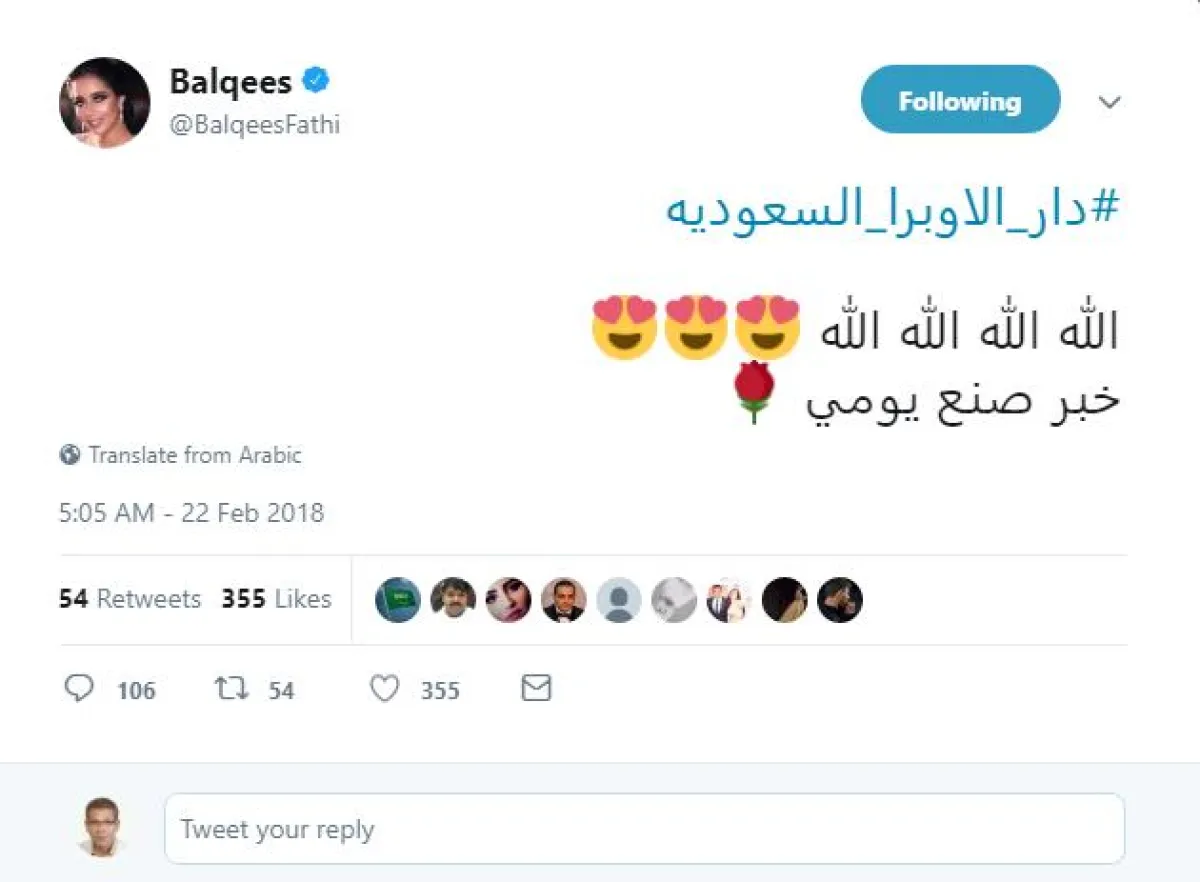 الفنانة اليمنية بلقيس، أبدت سعادتها بإنشاء "دار أوبرا" في السعودية، عبر حسابها الشخصي على موقع "تويتر"، حيث غردت قائلة:دار أوبرا السعودية.. الله الله خبر صنع يومي.