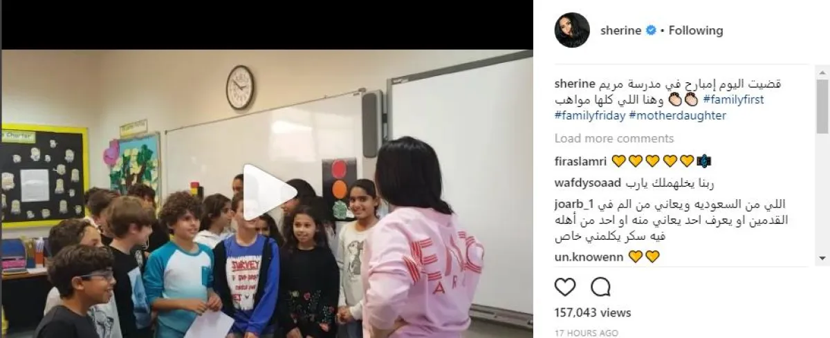 الفنانة شيرين عبد الوهاب، شاركت جمهورها مقطع فيديو من زيارتها لمدرسة ابنتيها مريم وهنا ، وظهرت شيرين خلال الفيديو الذى نشرته على صفحتها الشخصية بموقع إنستقرام، وهى تغني مع الأطفال أصدقاء ابنتيها، وحرصت على الاستماع لمعظم المواهب الموجودة بالمدرسة، معلقة على الفيديو قائلة: قضيت اليوم إمبارح في مدرسة مريم وهنا اللي كلها مواهب.