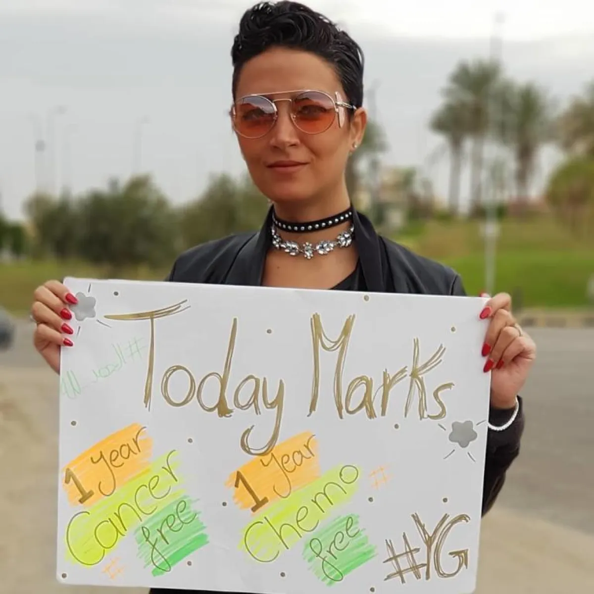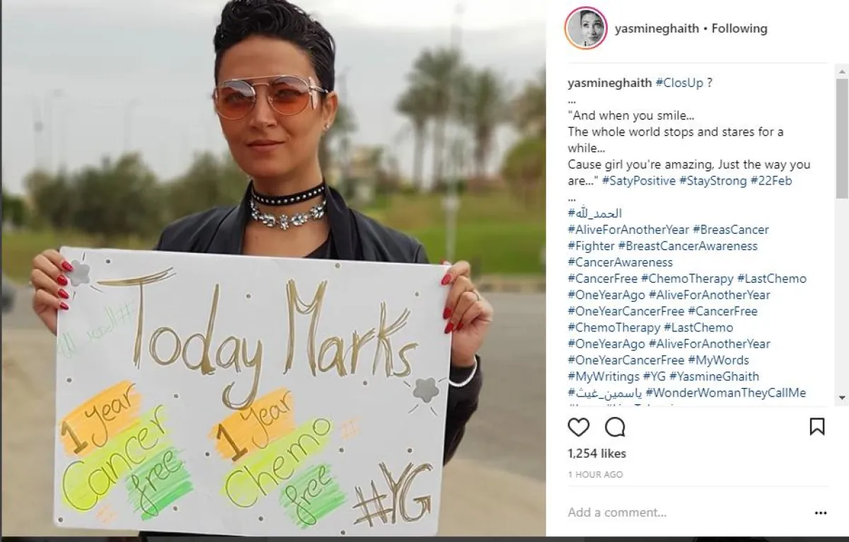 نشرت الفنانة ياسمين غيث صورة جديدة لها عبر حسابها على موقع إنستقرام، وظهرت ياسمين وهى تحمل لافته فى يدها، تعلن من خلالها أنها تعافت من مرض السرطان.