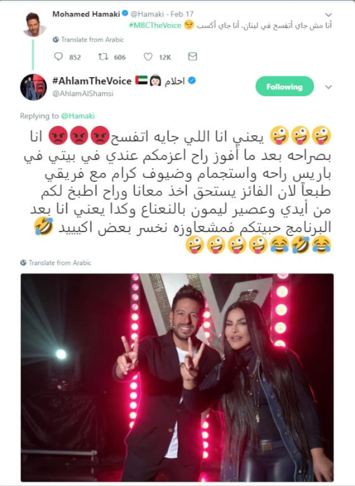 قبل ساعات قليلة من بث حلقة جديدة من مرحلة "الصوت وبس" بالموسم الجديد لبرنامج ذا فويس، اشتعل موقع تويتر ببوادر حرب بين عضوة اللجنة أحلام وزميلها محمد حماقي، بعدما أعاد الأخير نشر مقطع فيديو قال فيه لأعضاء اللجنة "عارفين مشكلتكم إيه معايا؟ إنكم فاكرين إني جاي أتفسح في لبنان.. أنا جاي أكسب".