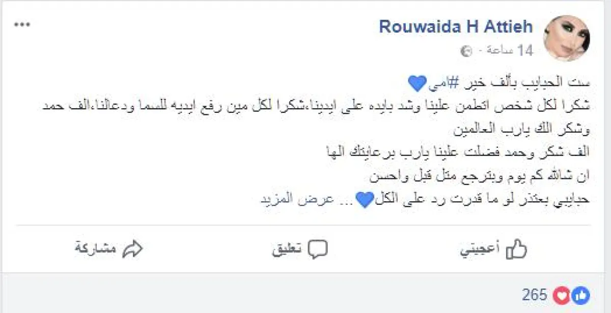وقالت رويدا عطية في منشورها: ست الحبايب بألف خير #امي.. شكرا لكل شخص اتطمن علينا وشد بايده على ايدينا، شكرا لكل مين رفع ايديه للسما ودعا لنا، الف حمد وشكر الك يارب العالمين .. الف شكر وحمد فضلت علينا يارب برعايتك الها .. ان شالله كم يوم وبترجع متل قبل واحسن .. حبايبي بعتذر لو ما قدرت رد على الكل».
