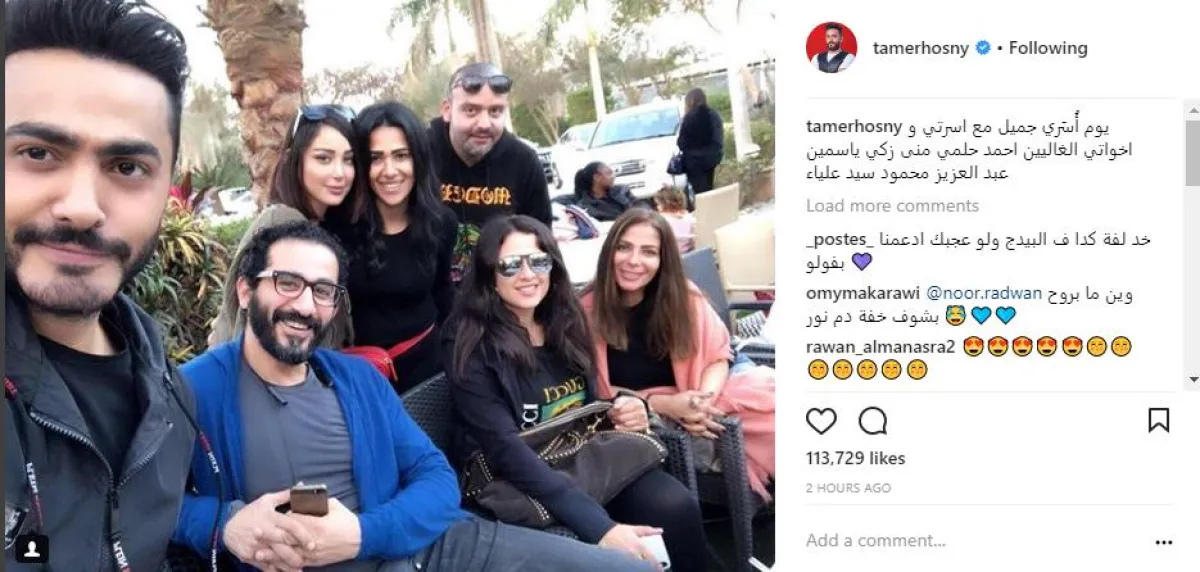 تامر حسنى نشر كواليس أول يوم أسري جمعه وزوجته بسمة بوسيل مع أحمد حلمى وزوجته منى زكي و ياسمين عبد العزيز، وعلق قائلا: يوم أُسَري جميل مع أسرتي و أخواتي الغاليين أحمد حلمي منى زكي ياسمين عبد العزيز محمود سيد علياء.