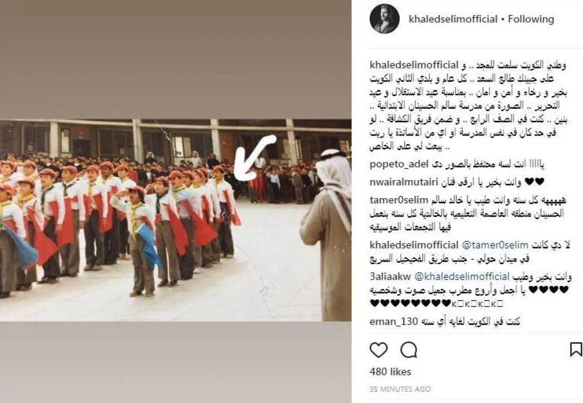 الفنان خالد سليم، استرجع ذكريات الطفولة فى دولة الكويت، بمناسبة عيدها الوطنى، حيث تلقى تعليمه الابتدائى فى مدرسة سالم الحسينان بمنطقة الخالدية، مطالبًا من زملائه مراسلته.