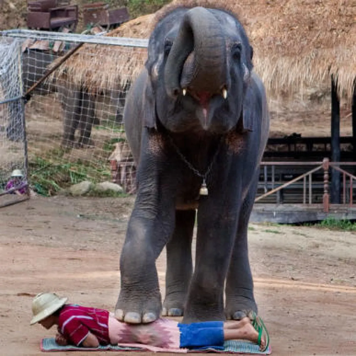 قد تكون الفكرة بحد ذاتها صاعقة.. فمن الصعب أن يتخيل الفرد نفسه نائماً مستسلماً تماماً لأرجل فيل ضخم لتحط على جسده وتدلكه.. هذا ما حدث لبعض السائحين في تايلاند!! ففي مخيم (Maesa Elephant Camp) السياحي في تايلاند المتخصص بتدريب الأفيال على القيام باستعراضات خارجة عن المألوف كلعب كرة القدم والرقص على أنغام الموسيقى واستعراضات السيرك، تم الإعلان عن تقديم خدمات التدليك المشهورة بها البلاد للسائحين المتواجدين في المكان، ولكن المفاجأة تكمن بالمدلك الغريب؛ حيث كان أحد الأفيال، وقد أثار الموضوع خوف السياح واستغرابهم الشديد، لذلك قام أحد مدربي الأفيال بالاستمتاع بأولى جلسات المساج من الفيل المدلك، أمام السياح لكسر حاجز الرهبة لديهم ولتشجيعهم على خوض التجربة الجديدة، وبالفعل فقد أثار العرض شهية الموجودين لخوض غمار هذه التجربة المثيرة!!
