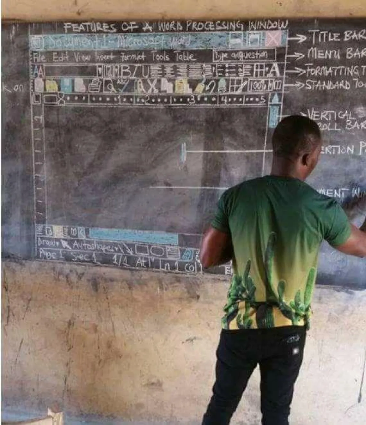 ويظهر من خلال الصور التي تم تنتاقلها، هذا المعلم وهو منشغل برسم البرنامج على سبورة القاعة الدراسية المتواضعة والمتهالكة الجدران، مُستخدمًا الـ"طباشير" التي يعرفها الجميع في المدارس، وحتى يُقرب شكل البرنامج الذي رسمه من شكل برنامج الكتابة "وورد Word" الحقيقي بأجهزة الحاسوب، قام باستخدام طباشير متعددة الألون، وعند كل تفصيل من البرنامج، كان يمد سهمًا إلى خارج الشكل المرسوم، كاتبًا اسم هذا التفصيل أو الأداء المستخدمة، وشرحًا وافيًا عنها.