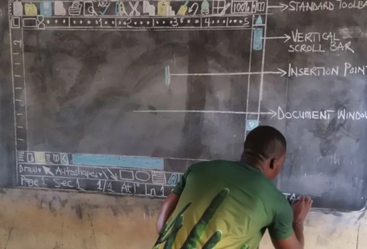 وفي تفاصيل هذه الحكاية الفريدة، قام معلم غانيّ، يعمل في مدرسة للأطفال بإحدى القرى النائية في البلاد، برسم برنامج الكتابة غلى الحاسوب "وورد Word" من مايكروسوفت، بكامل أجزائه وأدواته على سبورة الصف الدراسي، كاتبًا شرحًا مُفصلًا عن كل جزء وتفصيل في هذا البرنامج الأشهر في العالم، وذلك لعدم توفر الإمكانيات الكافية في المدرسة، لشراء أجهزة حاسوب "كومبيوتر" حقيقية، حتى يتم تعليم الطلاب مادة الحاسوب من خلالها، وذلك كما ذكرنا، بسبب قلة الحيلة والظروف المادية الصعبة التي تعيش فيها هذه القرية على وجه الخصوص، ودولة غانا بشكل عام.
