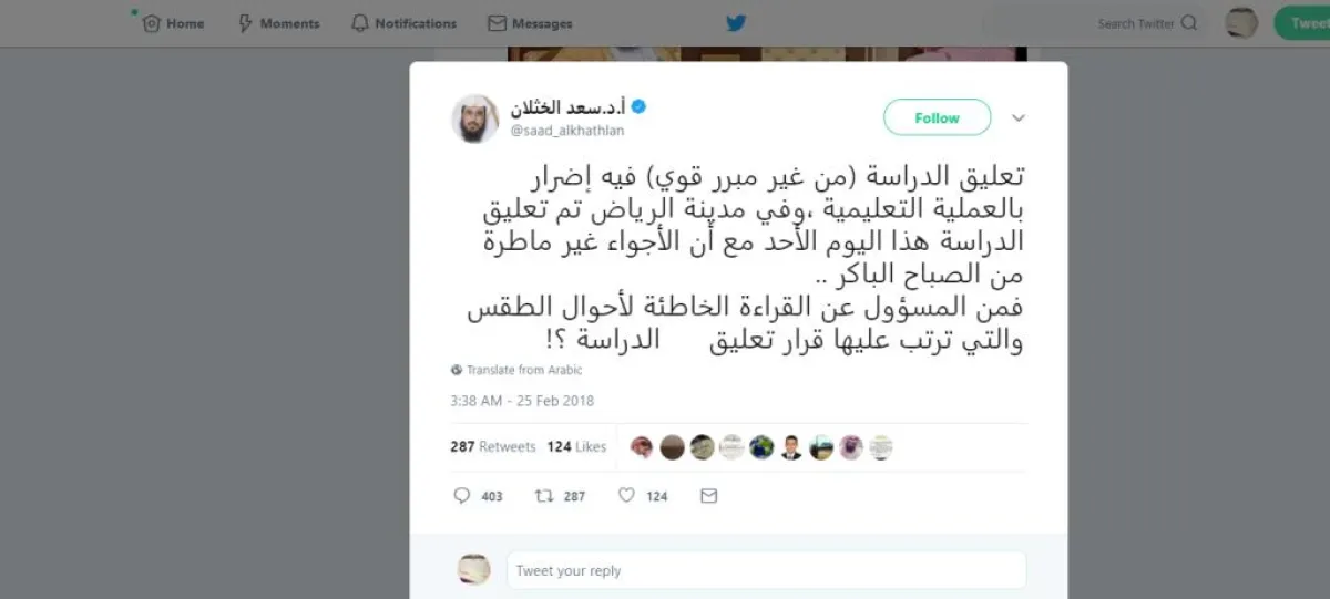 وقال في التغريدة: "تعليق الدراسة دون مبرر قوي فيه إضرار بالعملية التعليمية. في مدينة الرياض تم تعليق الدراسة هذا اليوم الأحد مع أن الأجواء غير ماطرة من الصباح الباكر! فمَن المسؤول عن القراءة الخاطئة لأحوال الطقس، ما ترتب عليه قرار تعليق الدراسة ؟".