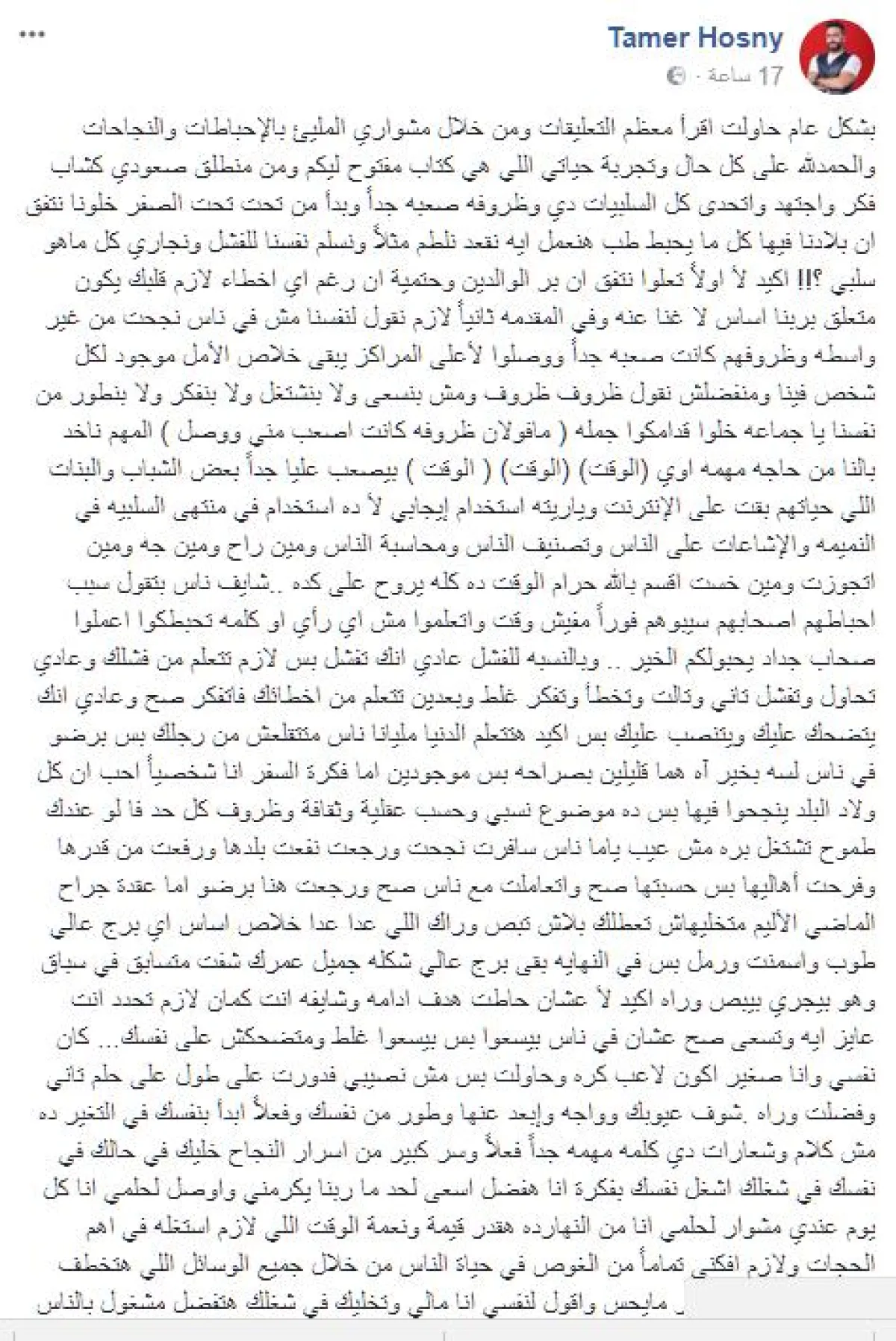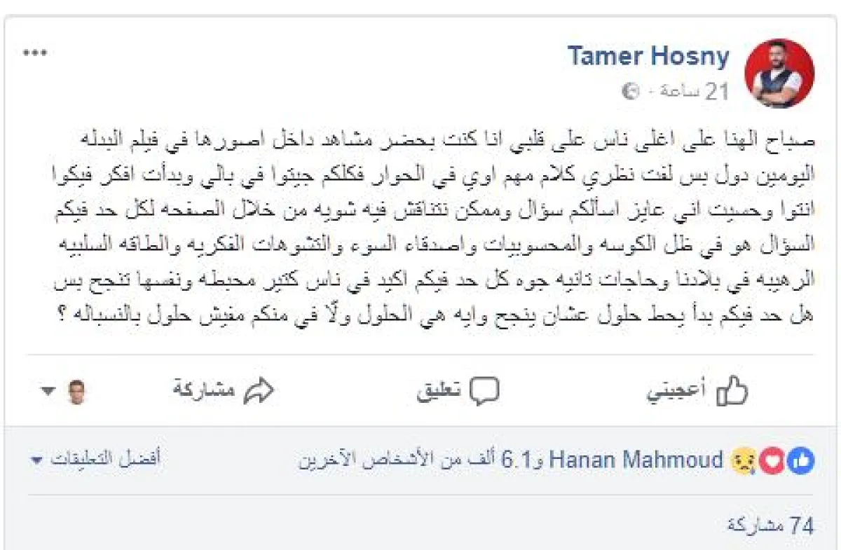 بالتفاصيل: تامر حسني على الفيس بوك يعالج الإحباط والطاقة السلبية