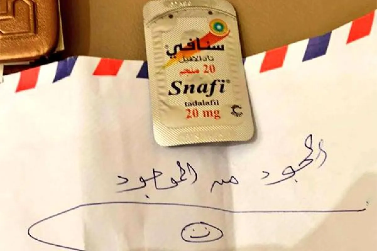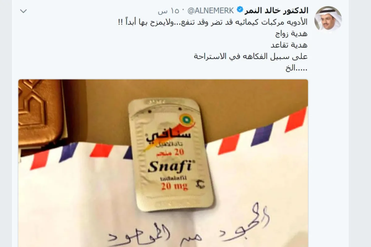 وأرفق الطبيب بتغريدته صورة، تُظهر شخصاً يهدي آخر شريطاً من عقار يعالج مشكلات جنسية لدى الرجال.