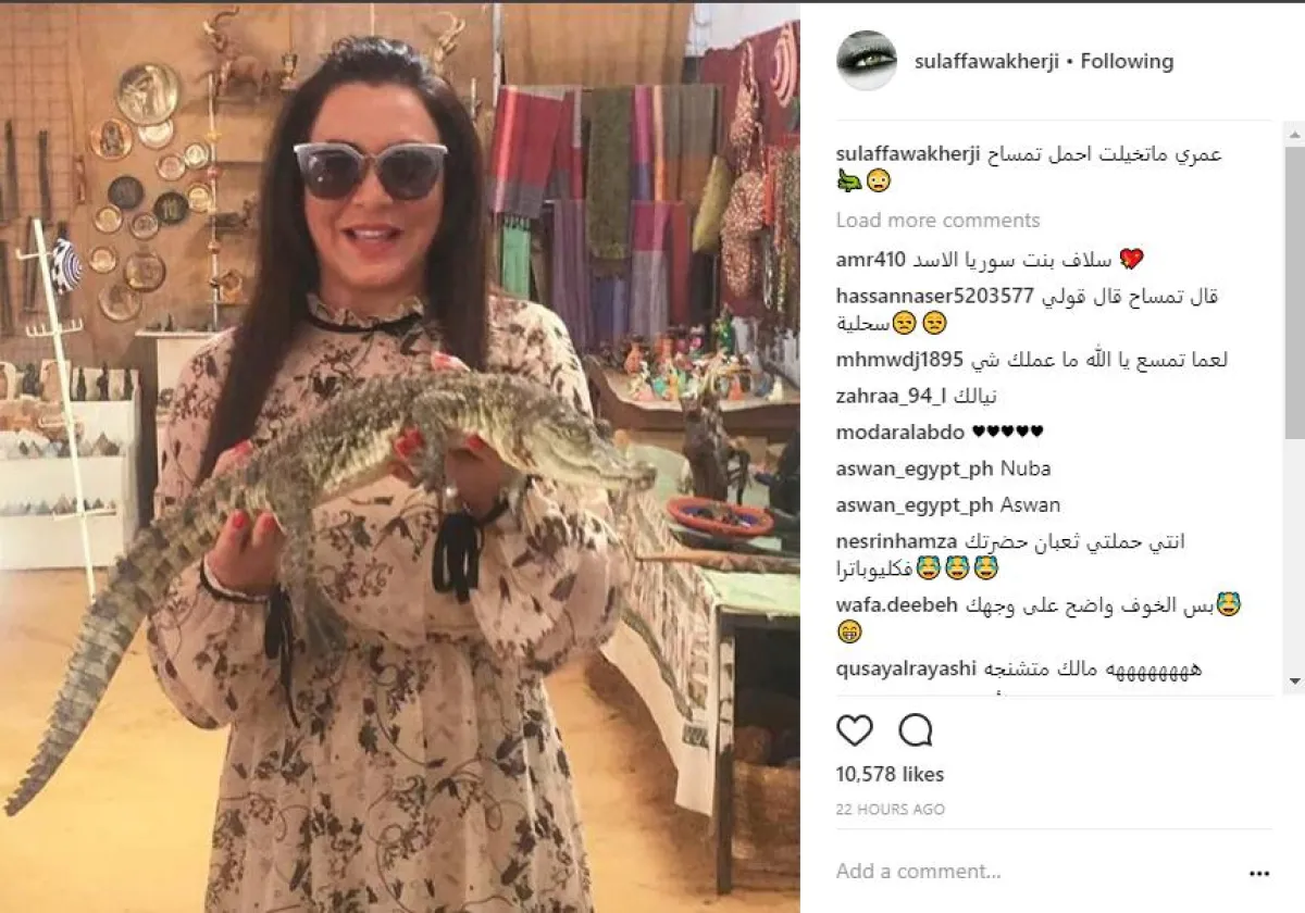 الفنانة سلاف فواخرجي استغلت وجودها في مدينة أسوان للمشاركة في فعاليات مهرجان سينما المرأة، ونشرت عبر صفحتها الشخصية على موقع انستقرام صورة جديدة لها وهي تحمل فيها تمساحًا، وعلّقت عليها قائلة عمري ما تخيّلت أحمل تمساح.