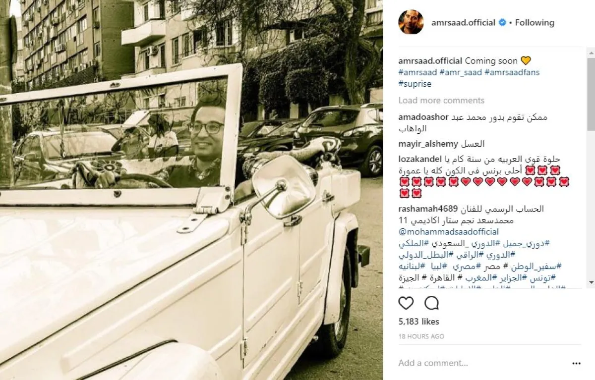 الممثل المصري عمرو سعد حيّر متابعيه على موقع انستقرام، بعدما نشر صورة له بالأبيض والسود وهو يقود سيارة قديمة جدًّا، في كواليس تشبه القاهرة في الأربعينيات من القرن الماضي، معلّقًا عليها بكلمة "قريبًا"، رافضًا الكشف عن قصتها، واللافت أنّ أغلب المعلقين نصحوه بتقديم شخصية الموسيقار محمد عبد الوهاب بعدما بدا الشبه بينهما قويًّا جدًّا.