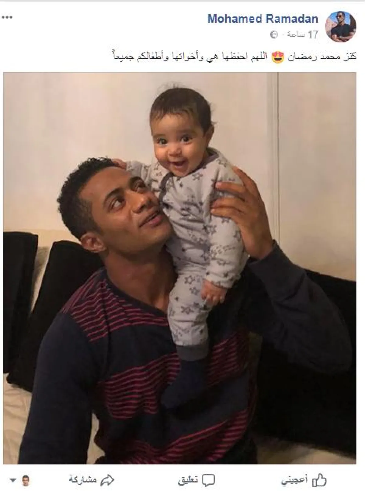 الفنان محمد رمضان اعتاد نشر صوره مع أطفاله الذكور، ولكنه بالأمس نشر صورة وهو يحمل ابنته الصغيرة كنز، وذلك عبر صفحته على موقع الفيس بوك ، وعلّق قائلًا : كنز محمد رمضان.. اللهم احفظها هي وأخواتها وأطفالكم جميعًا.