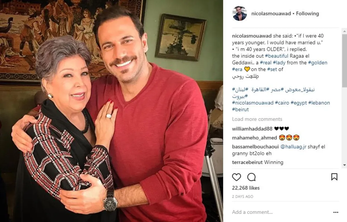 الممثل اللبناني نيكولا معوض نشر صورة برفقة الفنانة رجاء الجداوي، عبر حسابه الخاص على موقع انستقرام، من كواليس تصوير مسلسل "طلعت روحي"، وعلّق عليها قائلًا: قالت لي لو كنت 40 سنة أصغر كنت اتجوزتك، قلتلها أنا 40 سنة أكبر منك... الجميلة قلبًا وقالبًا #رجاء_الجداوي من العصر الذهبي".