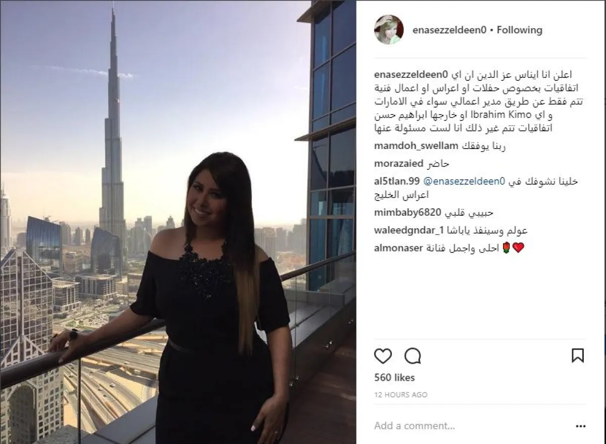 وكتبت إيناس عز الدين على صفحتها الشخصية بالموقع الشهير انستقرام: أعلن أنا إيناس عز الدين أنّ أيّ اتفاقيات بخصوص حفلات أو أعراس أو أعمال فنية، تتم فقط عن طريق مدير أعمالي إبراهيم حسن سواء في الإمارات أو خارجها، وأيّ اتفاقيات تتم غير ذلك أنا لست مسؤولة عنها.