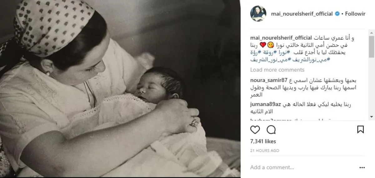 الفنانة مي نور الشريف نشرت عبر حسابها الموثق بموقع انستقرام صورة لها بعد ساعات قليلة من ولادتها، وهي في أحضان خالتها الفنانة نورا، وعلقت عليها قائلة: وأنا عمري ساعات في حضن أمي التانية خالتي نورا، ربّنا يحفظك ليّا يا أجدع قلب.