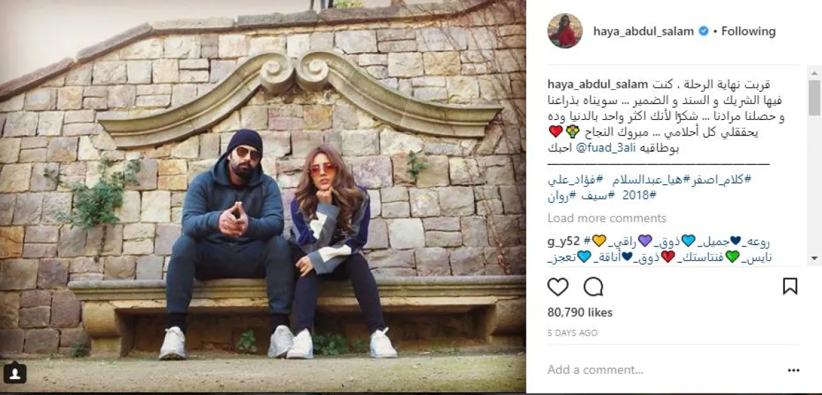 المخرجة والفنانة الكويتية هيا عبدالسلام، احتفلت باقتراب انتهاء تصوير مسلسلها الجديد "كلام أصفر"، بتوجيه رسالة رومانسية لزوجها الفنان فؤاد علي، الذي شاركها التمثيل في هذا المسلسل،