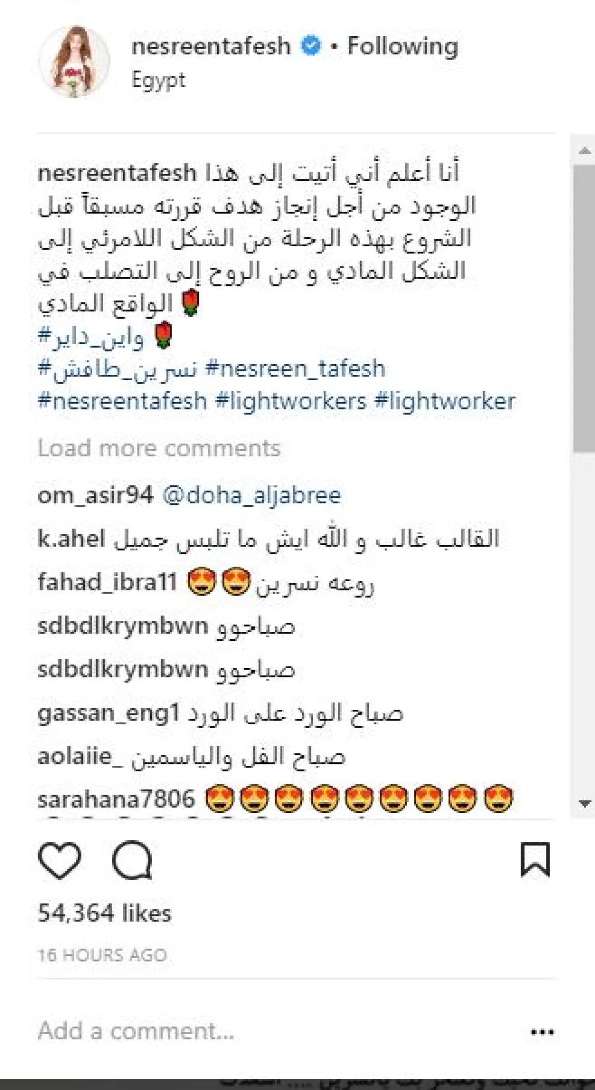 الفنانة السورية نسرين طافش نشرت عبر حسابها الشخصي بموقع انستقرام، صورة جديدة لها، وعلقت عليها بكلمات مقتبسة من الروائي الأمريكي واين داير، تقول: أنا أعلم أني أتيت لهذا الوجود من أجل إنجاز هدف قررته مسبّقًا قبل الشروع بهذه الرحلة، من الشكل اللا مرئي إلى الشكل المادي، ومن الروح إلى التصلب في الواقع المادي".