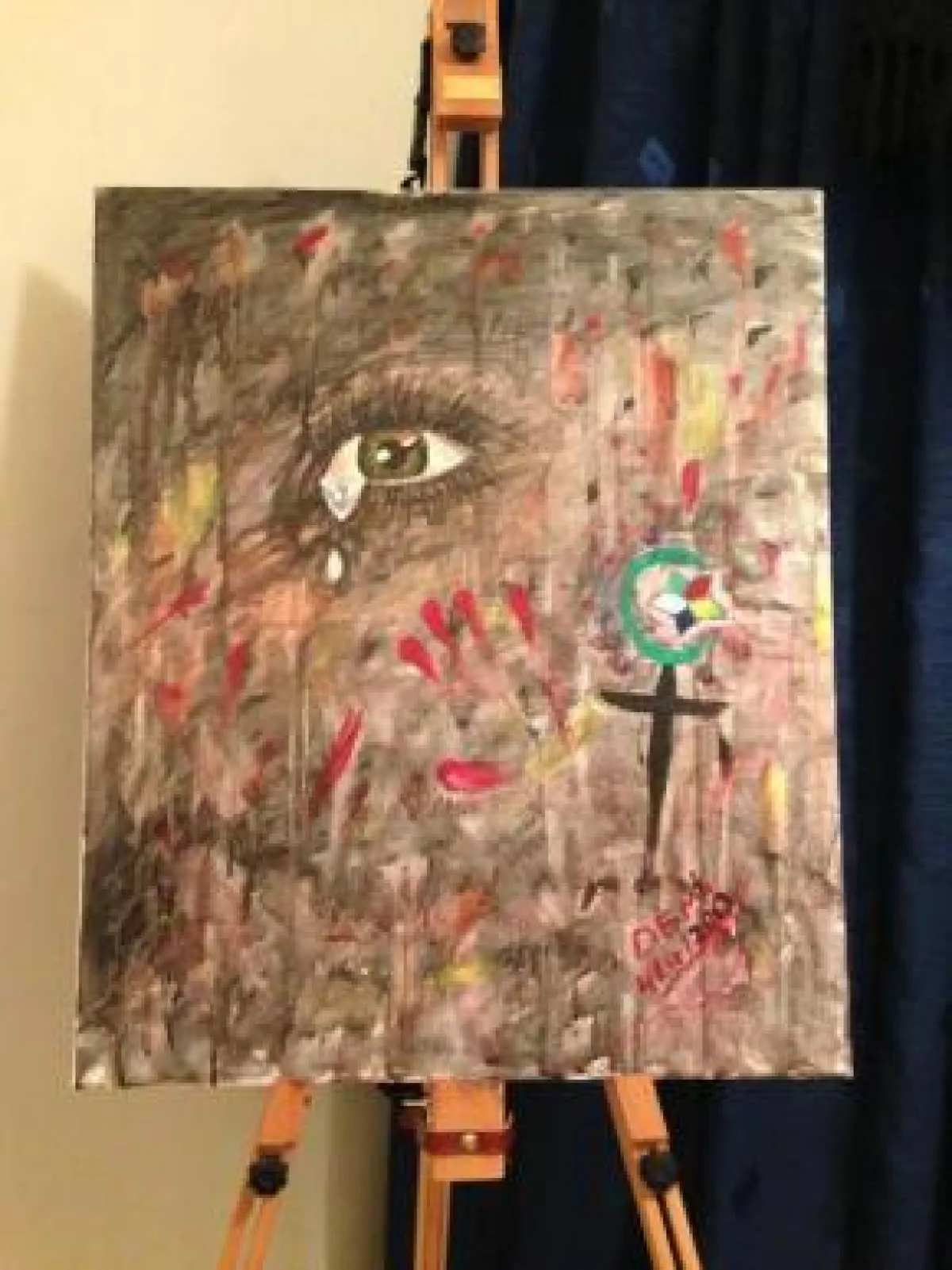 وتعبر اللوحة عن الأوضاع الدموية التي تعيشها بلادها سوريا منذ أكثر من عامين، وحاولت ديما أن تشير في اللوحة إلى ترابط أهل سوريا رغم تعدد الاديان فيها، فاحتوت اللوحة على صليب وفوقه هلال، وتبرز في اللوحة أيضاً عين دامعة، فيما يغرق بقية المشهد بالدماء.