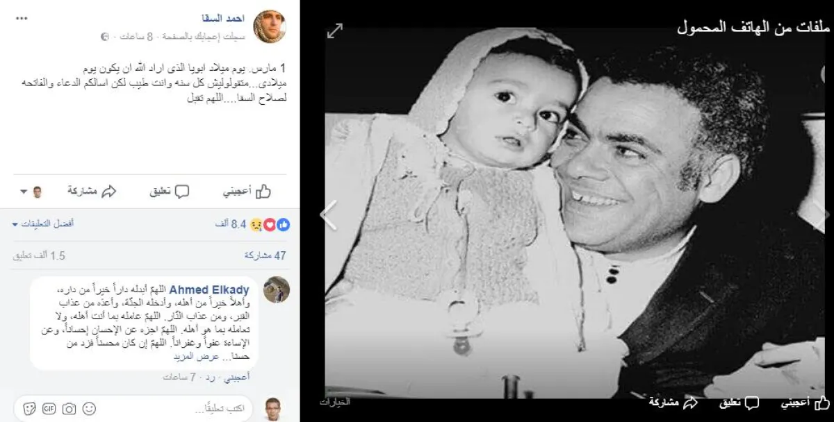أحمد السقا نشر صورة من طفولته برفقة والده عبر صفحته الموثقة بموقع الفيس بوك وعلق عليها قائلاً: 1 مارس. يوم ميلاد ابويا الذي اراد الله ان يكون يوم ميلادي...متقولوليش كل سنه وانت طيب لكن اسالكم الدعاء والفاتحة لصلاح السقا....اللهم تقبل.