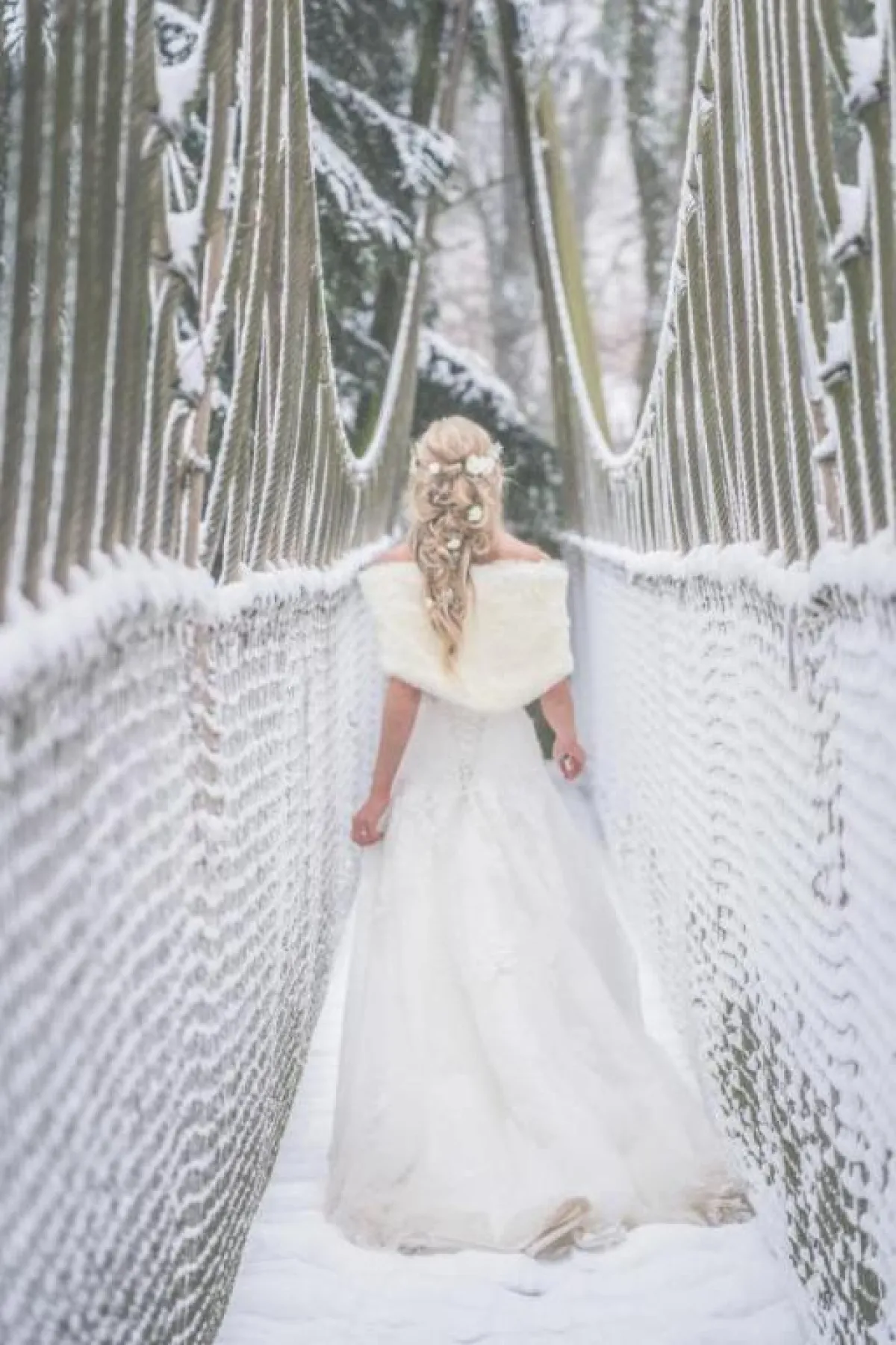 والتقطت صوراً رائعة للعروسين وهما سعيدان ويحتفلان وسط الجليد، وكأنها صور خرجت من إحدى القصص الخيالية.
