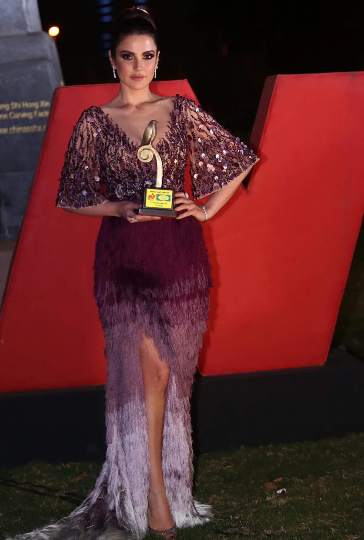 وصنع فستان درّة من الريش باللون البوردو والأبيض من الأسفل مع فتحة تصل إلى فوق الركبة ، ومن القماش الشفّاف المزيّن بالخرز البرّاق في القسم العلوي منه مع أكمام واسعة تصل إلى المرفق.