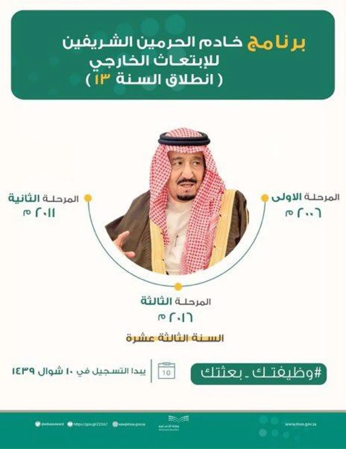 وأوضح أن الوكالة ستعلن المتطلبات، والتخصصات المتاحة على صفحة "برنامج خادم الحرمين الشريفين للابتعاث الخارجي": https://ksp.moe.gov.sa.
